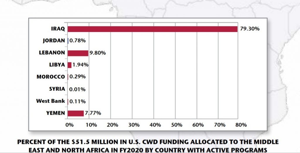 نشرت وزارة الخارجية الأميركية تقريرا حول جهودها لإزالة الألغام وتدمير الأسلحة التقليدية (CWD) في العالم تضمن الإشارة إلى منطقة الشرق الأوسط، حيث حاز العراق على نصيب الأسد من تلك الجهود.