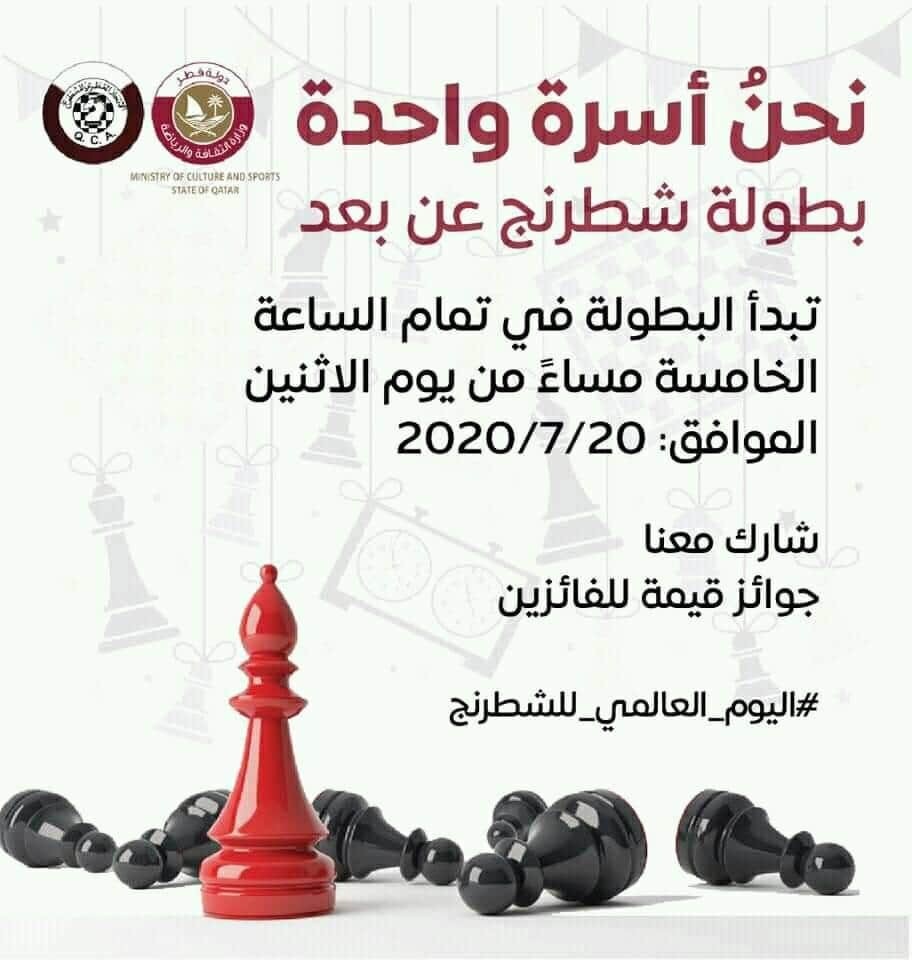 ونظم إتحاد الشطرنج القطري بطولة قطر الدولية بالشطرنج الخاطف اون لاين المفتوحة بمناسبة اليوم العالمي للشطرنج في 20 تموز يوليو الجاري، عبر منصة الموقع العالمي lichess وفق النظام السويسري بـ 18 جولة وزمن المباراة 3 دقائق مع إضافة ثانية لكل نقلة منجزة (بليتز) ، وشارك 2000 لاعب ولاعبة من جميع أنحاء العالم اغلبهم لاعبين كبار حاملين الألقاب الدولية مثل GM و IM .