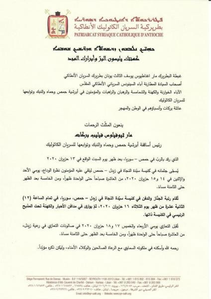 النعي الرسمي للمثلّث الرحمات مار ثيوفيلوس فيليب بركات رئيس أساقفة أبرشية حمص وحماة والنبك وتوابعها للسريان الكاثوليك: