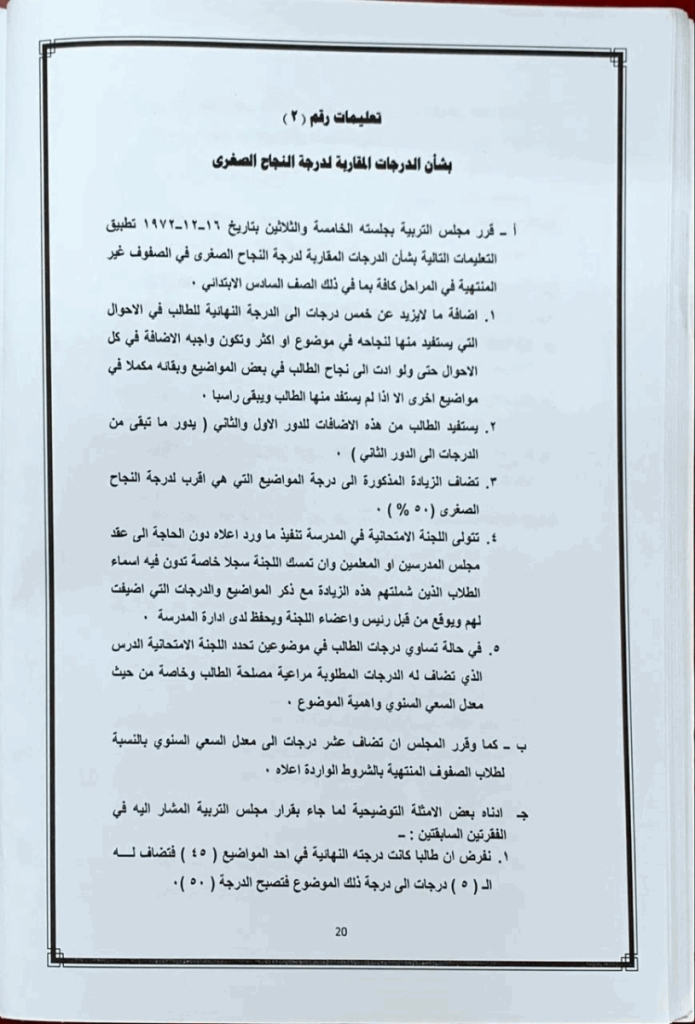 وأضاف، أنه “تنسب أيضاً، قيام مراكز فحص الدراسة الابتدائية في المديريات العامة بحفظ نتائج الصف السادس الابتدائي للتلاميذ واعتبارها درجة الدور الأول، أما التلميذ الراسب بدرس واحد أو أكثر تكتب عبارة معيد في حقل النتيجة وبعد قيام مراكز الفحص بإدخال الدرجات تزود المدارس بالنسخ الورقية للنتائج وتزويد قسم الامتحانات في المديريات العامة والمديرية العامة للتقويم والامتحانات على شكل (cd) لغرض حفظ البيانات واعتمادها، وستقوم مديرية التقويم والامتحانات بتحديد مواعيد امتحانات الدور الثاني للتلاميذ الراسبين لاحقاً”.