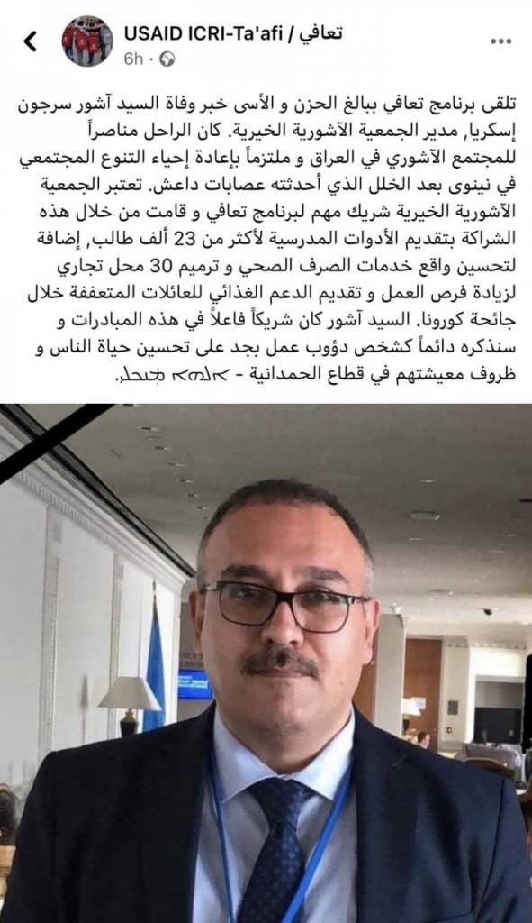 عزى برنامج تعافي (USAID ICRI-Ta’afi) الرفيق اشور سركون اسخريا رئيس الجمعية الآشورية الخيرية.