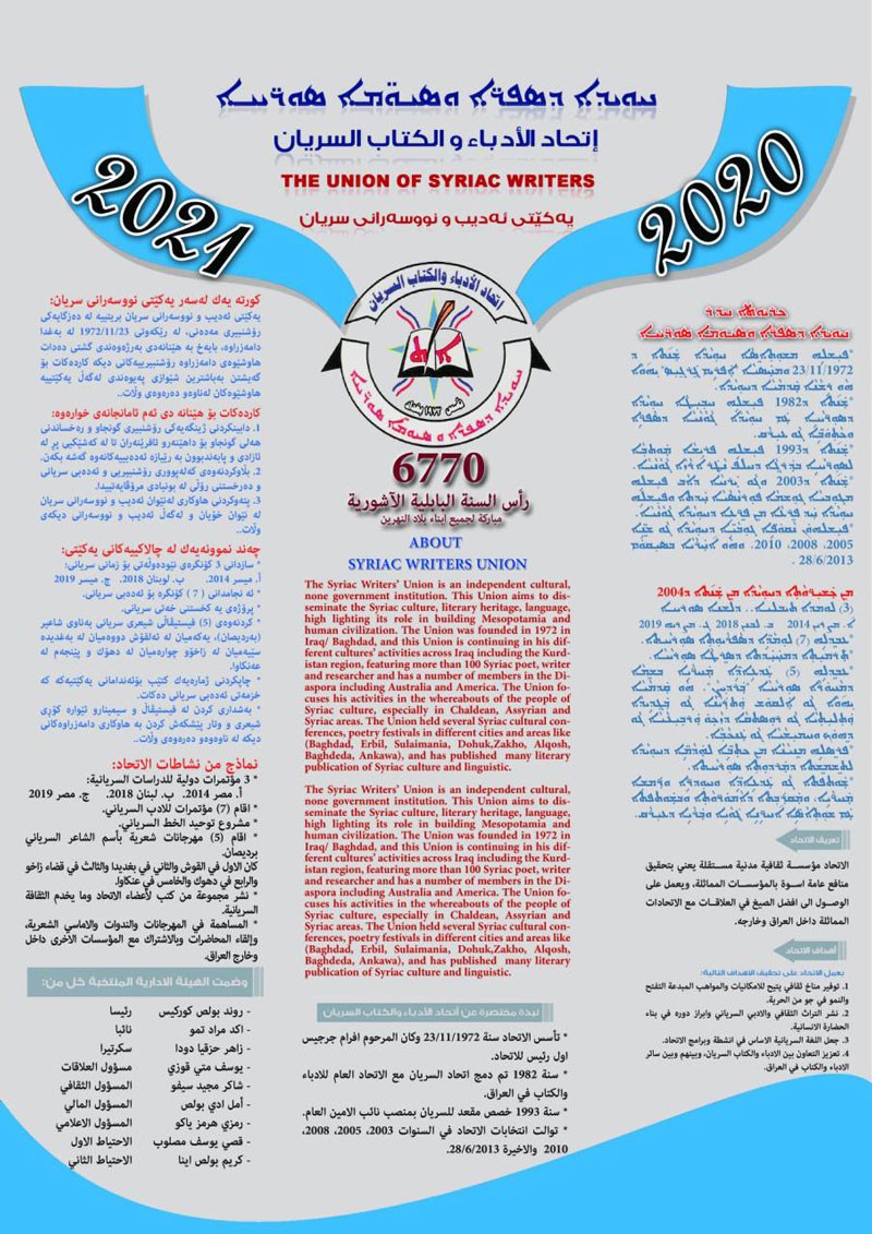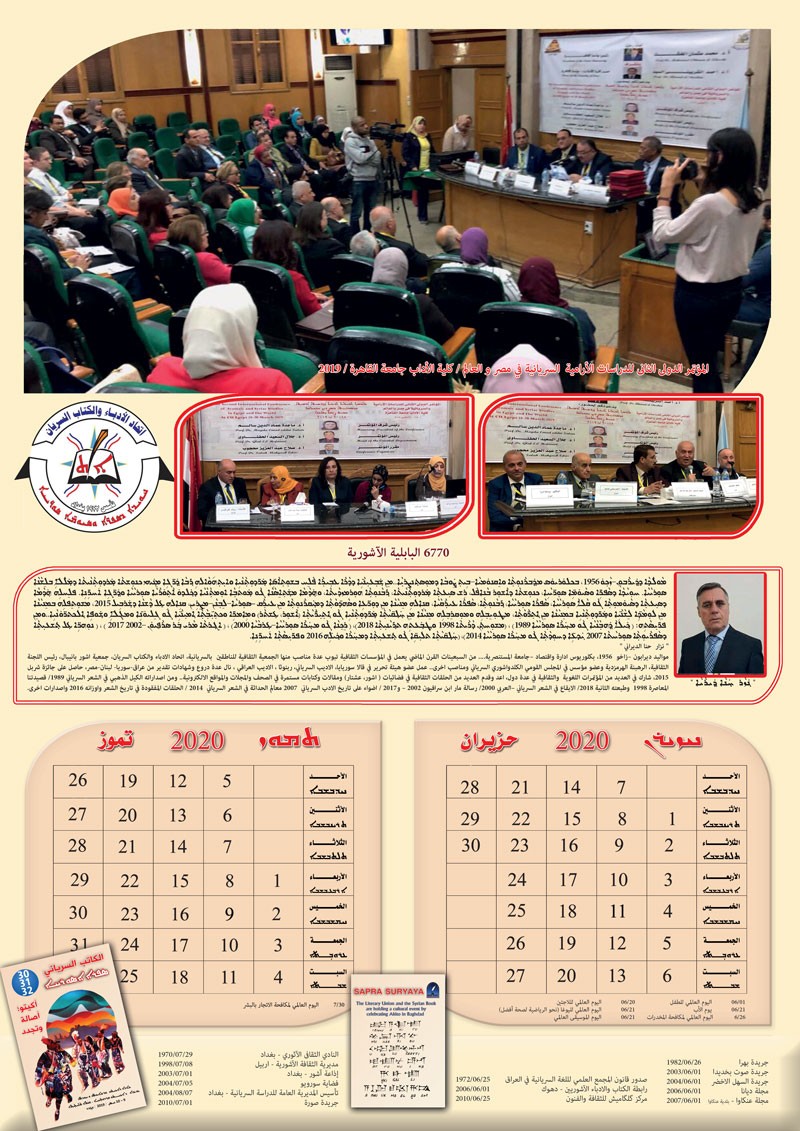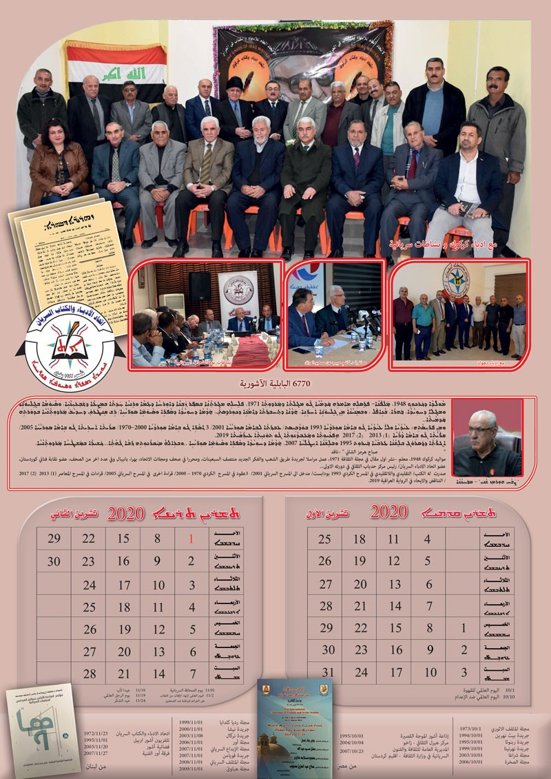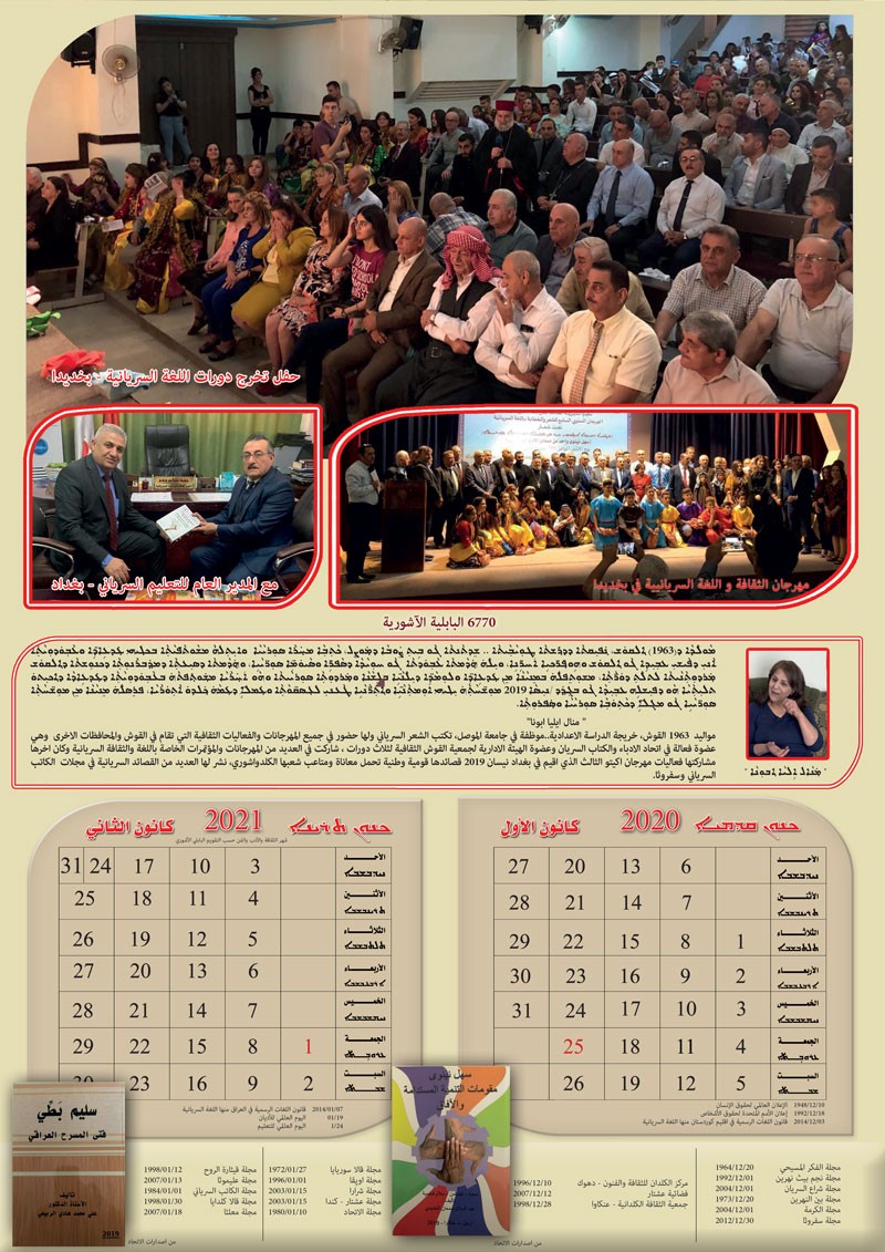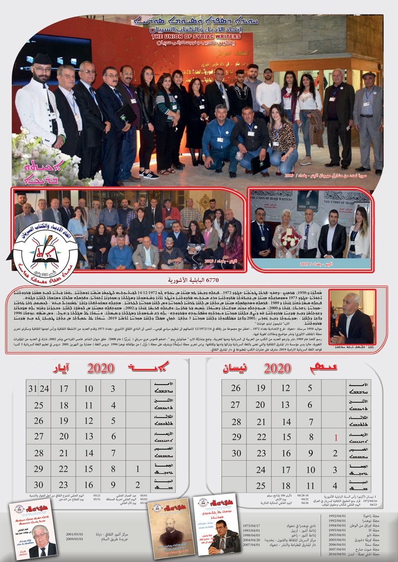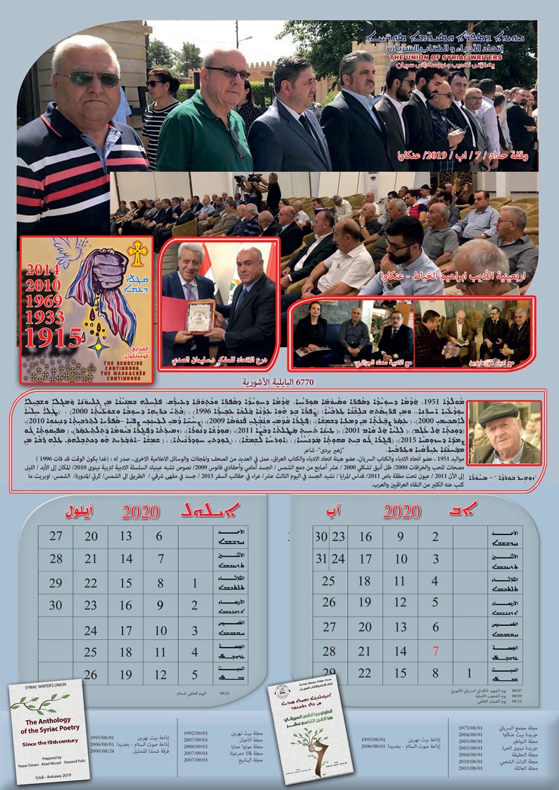 بالرغم من جائحة كورونا أصدر الاتحاد تقويمه الثقافي لهذا العام ( 220-221 ) وتضمنت صفحته الأولى والتي تبدأ بشهري نيسان وآيار صور من مهرجان أكيتو الثقافي والذي أقامه اتحاد الأدباء والكتاب السريان بالتعاون مع المكتب الثقافي السرياني في الاتحاد العام  في العاصمة العراقية ” بغداد ” للفترة من 9 – 10 نيسان 2019،  الصفحة الثانية من التقويم تضمنت صورا عن المؤتمر الدولي الثاني للدراسات السريانية في جامعة القاهرة بمصر للفترة 10-12 آذار 2019 ،  الصفحة الثالثة منه خصصت  لوقفة الحداد التي نظمها الاتحاد أمام كاتدرائية ماريوسف في عنكاوا في السابع من آب ذكرى مذابح سميل و يوم الشهيد الكلداني السرياني الأشوري ، الصفحة الرابعة من التقويم تضمنت لقطات من الفعالية الثقافية التي اقيمت في كركوك في آذار 2019 و المخصصة لتكريم عدد من أدباء السريان  من قبل اتحاد الأدباء و الكتاب في كركوك ،  الصفحة الخامسة منه تضمنت لقطات من مهرجان الثقافة  واللغة السريانية وحفل تخرج دورات اللغة السريانية في بغديدا ، الصفحة السادسة والأخيرة من التقويم تضمنت صورة لعدد من كوادر التعليم السرياني و لقطات اخرى عن نشاط طلبة المدارس السريانية في عنكاوا.