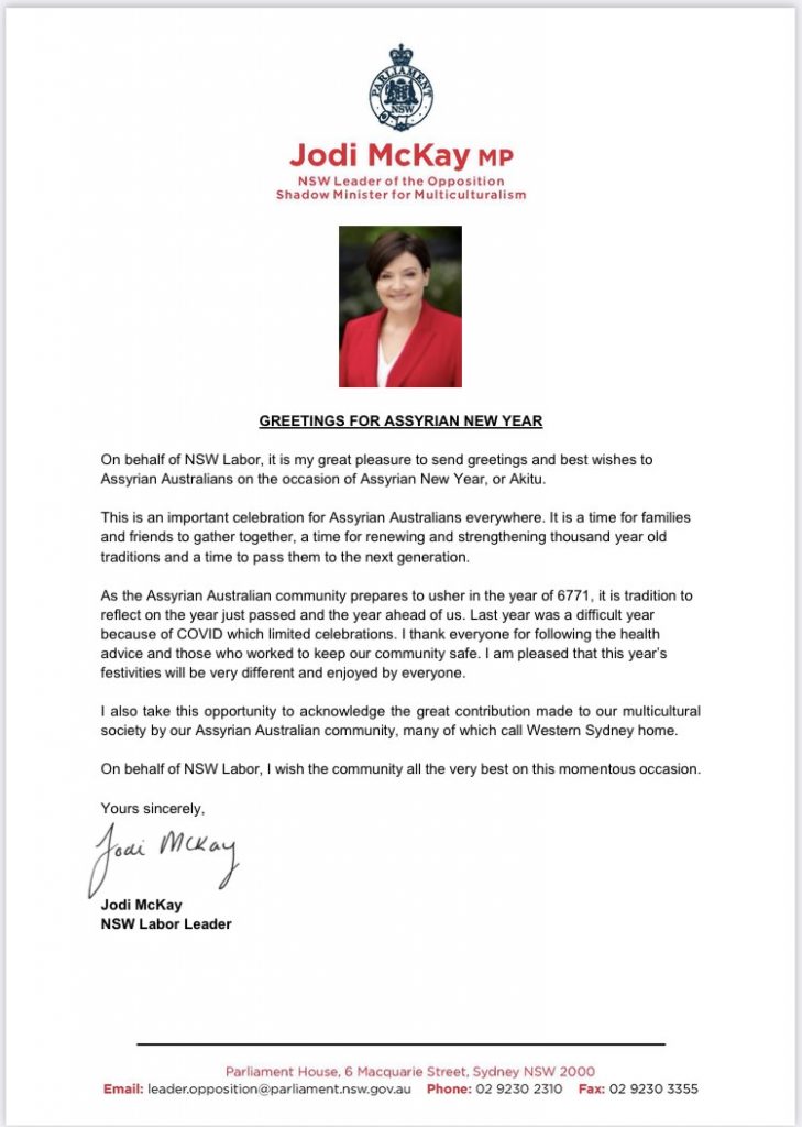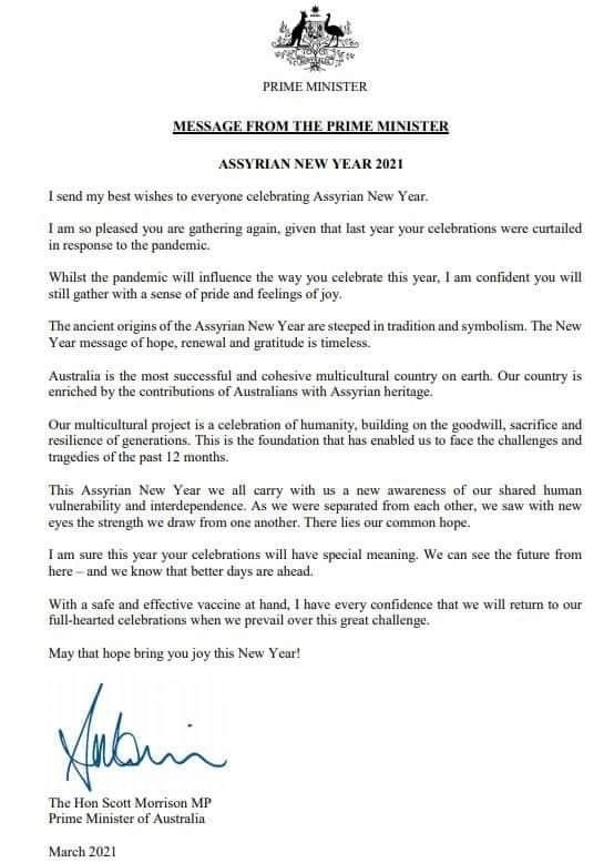 رئيس الوزراء الاسترالي السيد سكوت موريسون من حزب الاحرار الحاكم يهنئ الشعب الاشوري بمناسبة راس السنة البابلية الاشورية (اكيتو) ٦٧٧١ آ ، وكذلك بعثت السيدة جودي مكاي رئيسة حزب العمال المعارض في ولاية نيو ساوث ويلز رسالة تهنئة بهذه المناسبة واليكم نسخه منها.