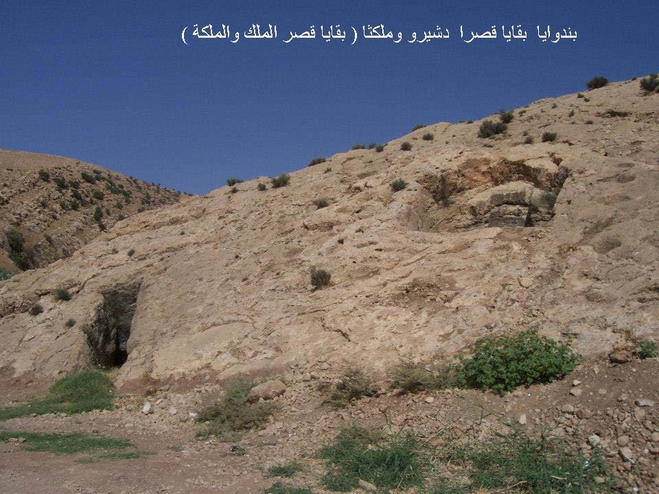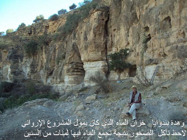 اليكم الصور التي التقطها لمشروع شميرام ( سامورامات ) سميراميس الملكة الاشورية الشهيرة في وهدة بندواية التي اتوقع ان تكون البحيرة التي اجتمعت فيها المياه الى ارتفاع يزيد على عشرة امتار ولاحظ في الصورة تخلخل الصخور في القسم الاسفل التي من المقترض كانت مغمورة بالمياء الى الحد الذي تراه واضحا .وعلى امتداد ثمانية كيلومترات باتجاه جنوب شرق بندواية التقطت صورا لبقاية الجدول الاروائي الذي يدعى اليوم ( خبراثا دخنداقي ) اي حفريات الخنادق.. وبامكان المشاهد الكريم ان يرى في الصور امتداد المشروع وارتفاع اكتافه وعرضه وعمقه وهذا ما تبقى منه بعد 2800 عام واليكم الصور .