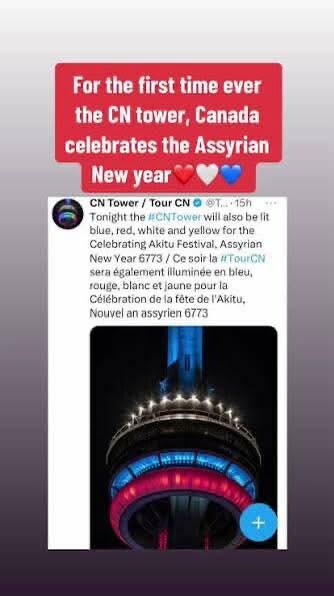 وفي كندا، جاءت رسالة التهنئة الرسمية من رئيس الوزراء مارك كارني لتعكس تقديرًا واضحًا للدور الذي تؤديه جاليتنا في الحياة العامة الكندية، فيما تجسد الحضور الرمزي للمناسبة بإضاءة برج CN Tower بألوان العلم الآشوري، في مشهد حمل دلالات معنوية عميقة، واختزل معنى الاعتراف والاعتزاز والاحتفاء.