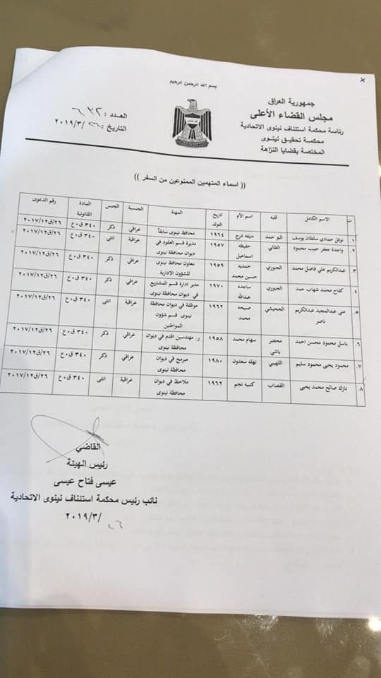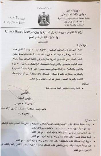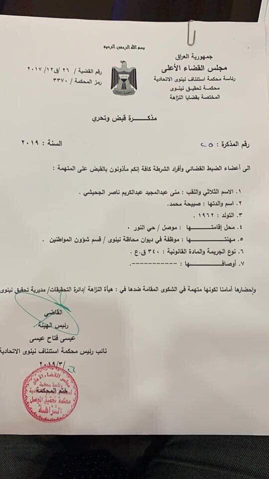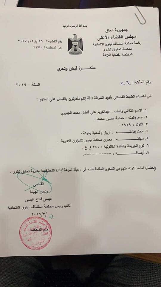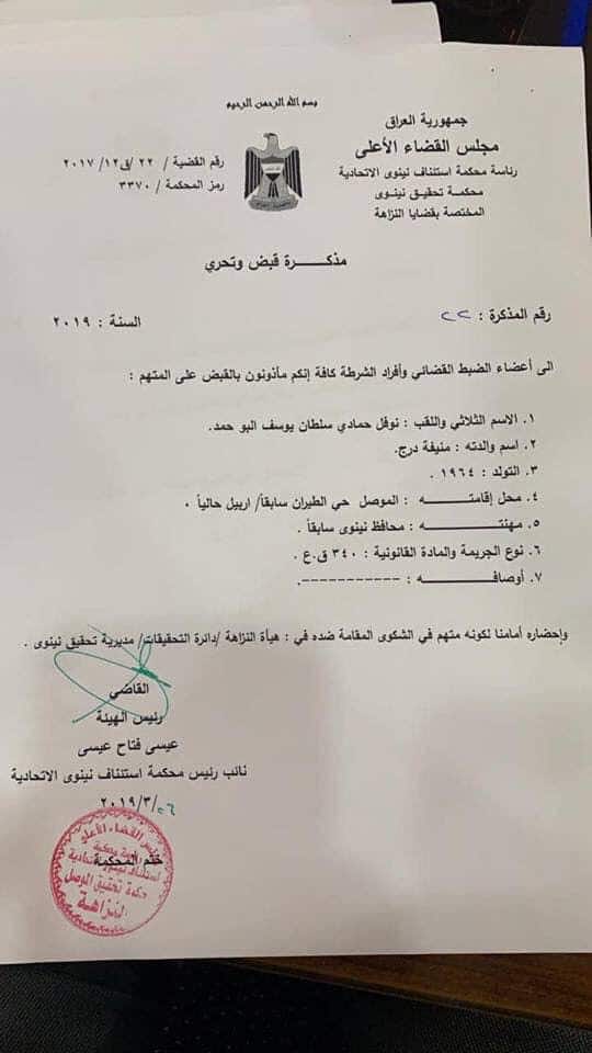 وبحسب المذكرة الصادرة من المحكمة، امس الاربعاء، فان “اعضاء الضبط القضائي وافراد الشرطة كافة مأذونون بالقبض على المتهم (نوفل سلطان حمادي البو محمد ) محافظ نينوى السابق والذي يسكن اربيل حاليا بحسب المادة 340 ق.ع.