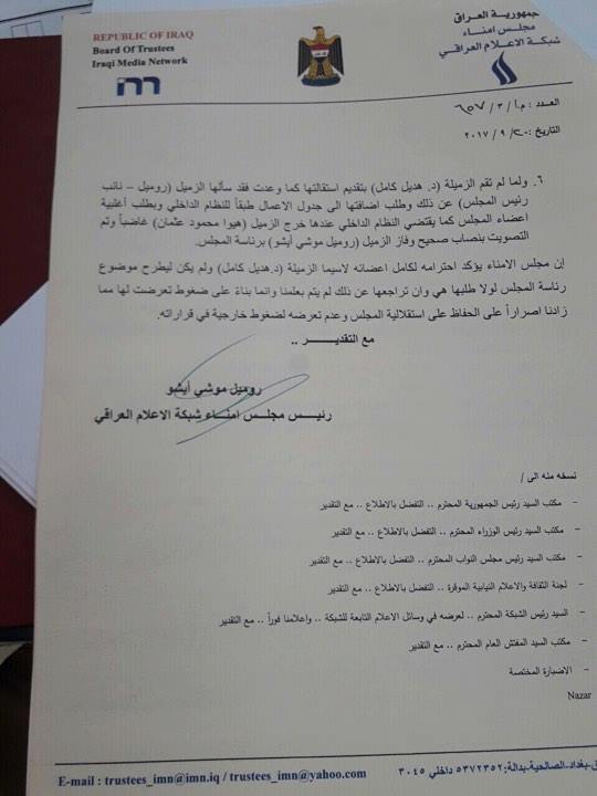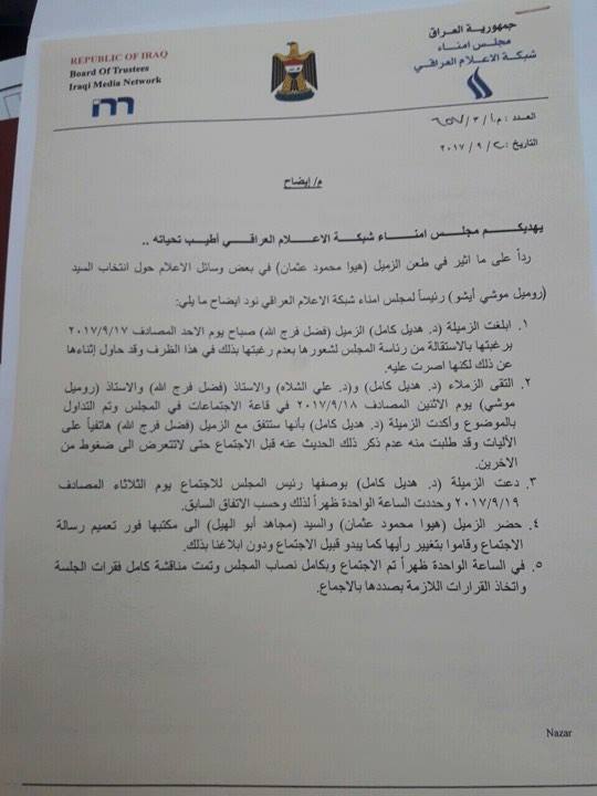 Home /الاخبار/الوطنية والدولية/إيضاح من مجلس أمناء... إيضاح من مجلس أمناء شبكة الاعلام العراقي حول ما اثير في طعن هيوا محمود عثمان في بعض وسائل الاعلام حول انتخاب روميل موشي رئيسا للمجلس Posted on 27 سبتمبر, 2017 by admin