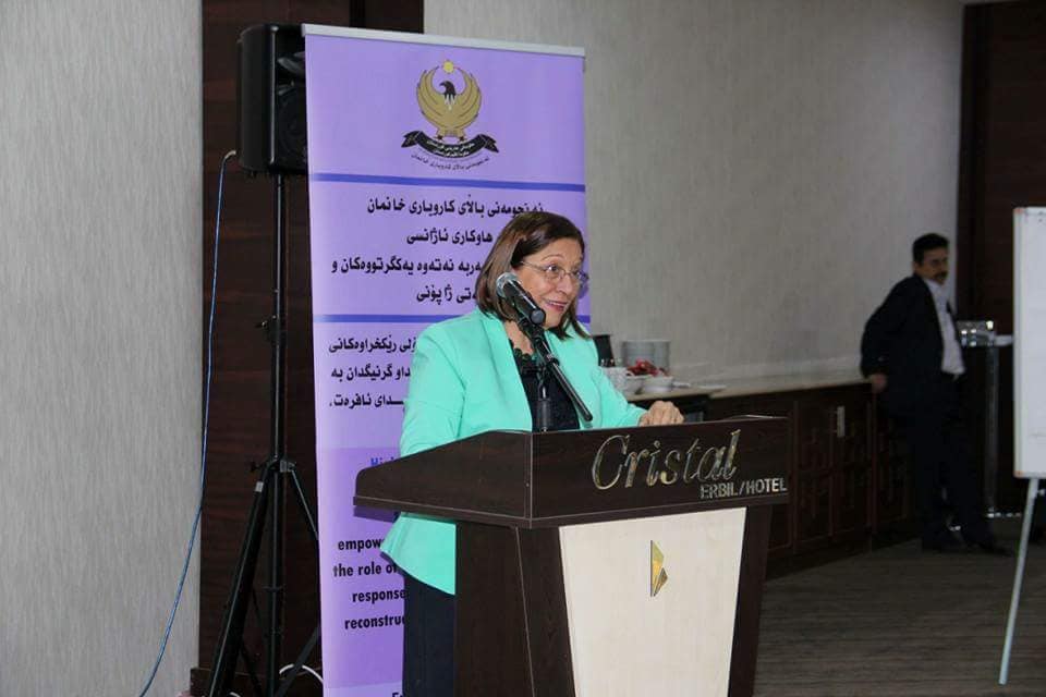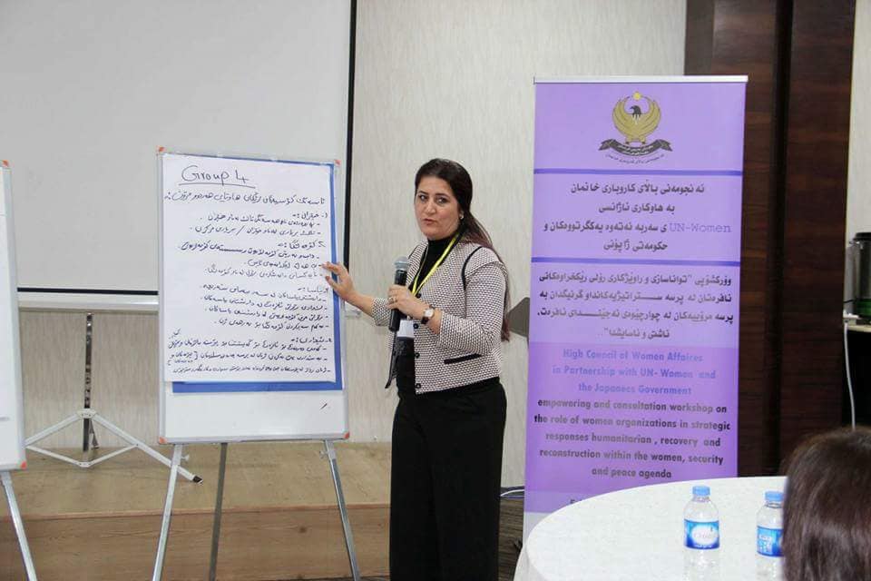 عقدت هيئة الأمم المتحدة للمرأة (UN WOMEN) بالتعاون مع المجلس الأعلى لشؤون المرأة في إقليم كردستان وبدعم من الحكومة اليابانية،ورشة عمل في أربيل للفترة من 27 ـ 29 آذار 2018 للتمكين والتشاور حول دور المنظمات النسوية للتشاور في الاستجابات الاستراتيجية، والتركيز على الاستجابات الانسانية ضمن اجندة قرار 1325 (المراة و الأمن و السلام).