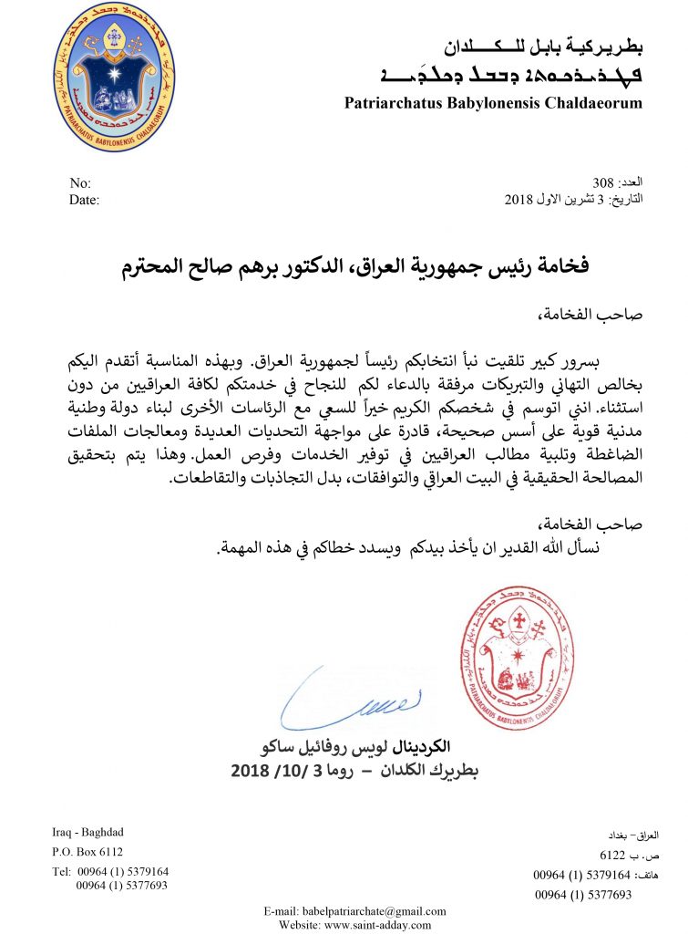 بعث غبطة أبينا البطريرك مار لويس روفائيل ساكو برقية تهنئة الى الرئيس العراقي الجديد الدكتور برهم صالح فيما يلي نصها: