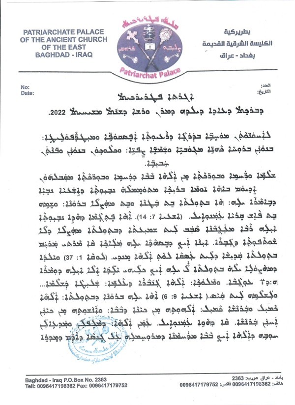 أدناه الرسالة البطريركية لقداسة مار أدى الثاني جاثليق بطريرك الكنيسة الشرقية القديمة في العراق والعالم لمباركة عيد الميلاد المجيد والسنة الميلادية الجديدة 2022، صورة من النسخة الأصلية بالسريانية مع الترجمة العربية المعنوية: