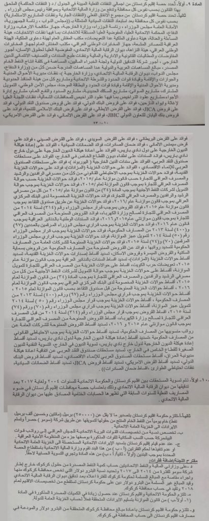 وبحسب الوثيقة فأن المادتين 9 و 10 من مشروع الموازنة تتضمن المواد الخاصة باقليم كردستان والتي تلزم الاقليم بتسليم 250 الف برميل من النفط يوميا لشركة سومو حصرا، وحسب المادة التاسعة الخاصة بإقليم كردستان فأن “حصة الإقليم تحدد من إجمالي النفقات الفعلية بعد استبعاد النفقات السيادية بحسب عدد سكان كل محافظة وتدفع من وزارة المالية الاتحادية بموافقة رئيس الحكومة “، من دون الاشارة الى اية نسبة محددة.
