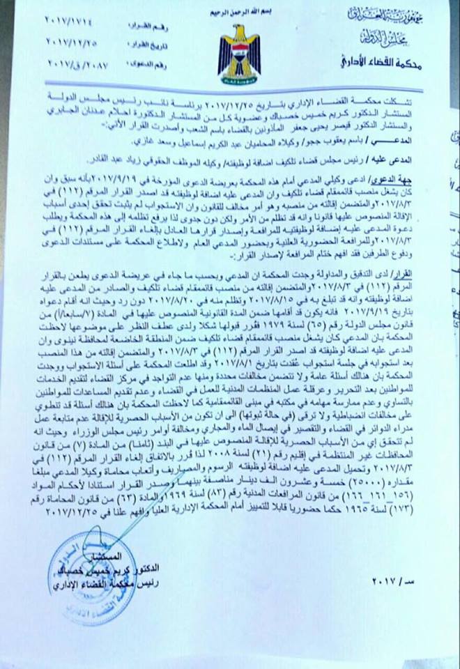 وادناه صورة عن نص كتاب الغاء قرار مجلس قضاء تلكيف بإقالة القائمقام باسم بلو ، الصادر من محكمة القضاء الاداري ..