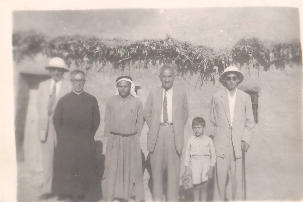 في دير مار بهنام ببناية رهبان شارل دو فوكو ، نحن جماعة السفرة يتوسطنا الراهب عبدالله وهو فرنسي لابسا ثياب اهل القرى 3-5-1953 القس حنا رحماني وحنا الرسام وعزيز بطرس والصغير رياض حبابه