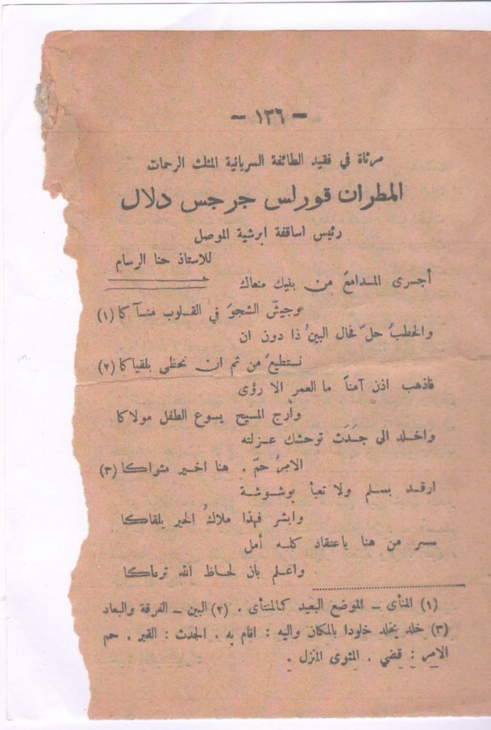 كما أنشد قصيدة شعرية جاءت في 36 بيتًا في تأبين المطران جرجس دلاّل 1952 جاءت قوية السبك متينة العبارة (يقرأ المطالع بضعة أبياتها الشعرية في الصورة المرفقة).