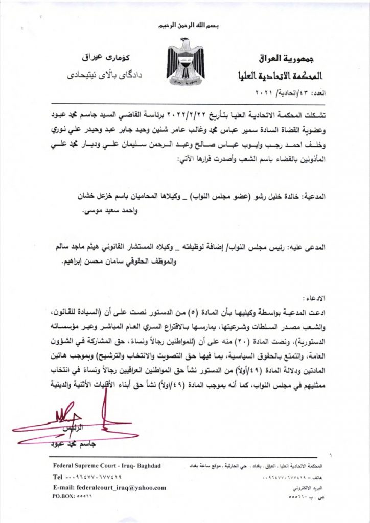 وأصدرت المحكمة قرارها على خلفية الدعوى المقامة من خالدة خليل رشو، عضو مجلس النواب العراقي، ووكيلاها المحاميان باسم خزعل خشان واحمد سعيد موسى، على المدعى عليه رئيس مجلس النواب اضافة لوظيفته، ووكيلاه المستشار القانوني هيثم ماجد سالم، والموظف الحقوقي سامان محسن ابراهيم.