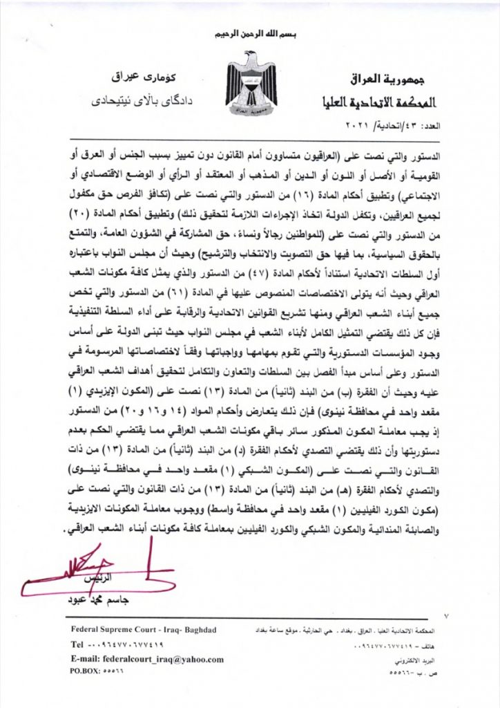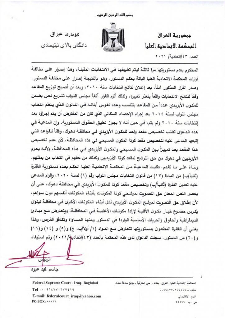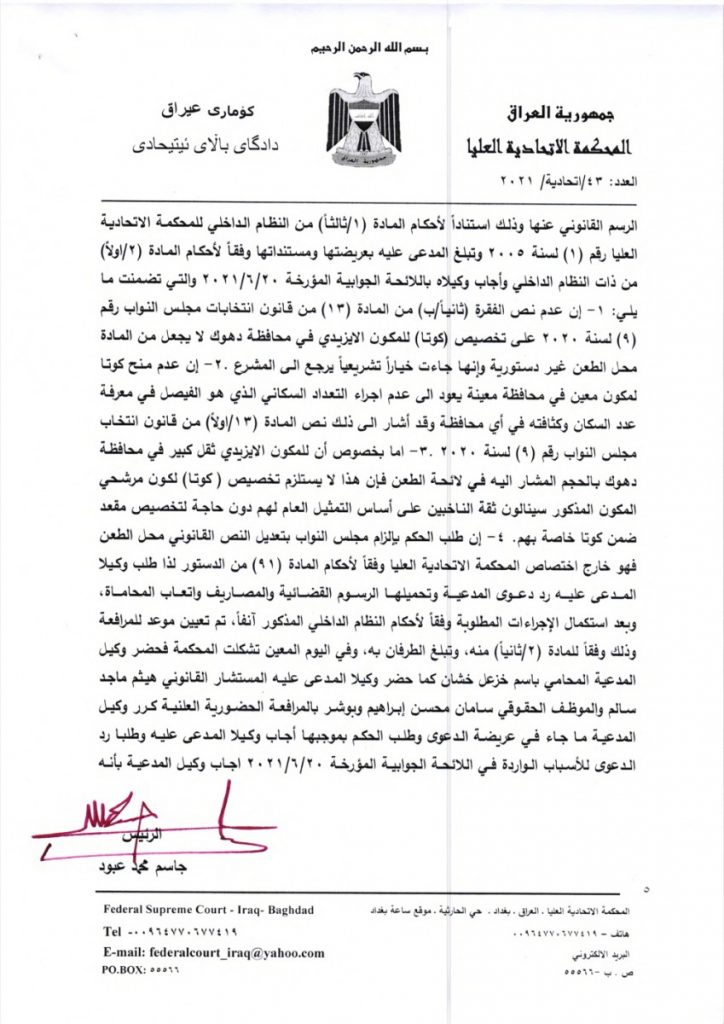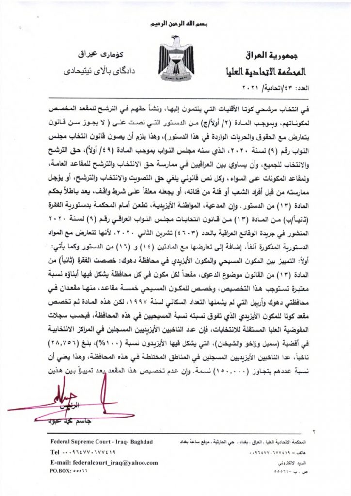 قضت المحكمة الاتحادية بعدم دستورية الفقرات الخاصة بمقاعد الأيزيديين والشبك والكورد الفيليين في مجلس النواب.