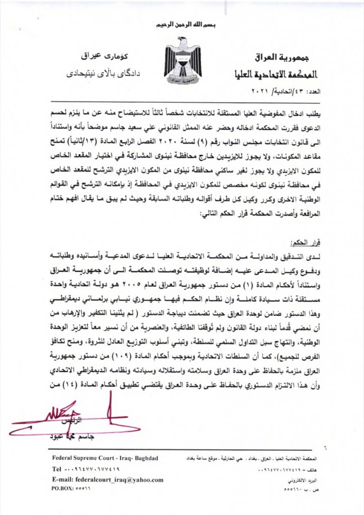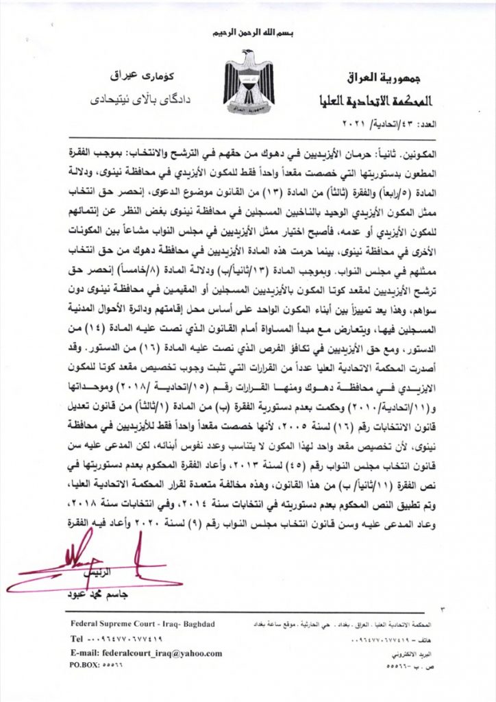 وقررت المحكمة ان الفقرة (ب) من البند الثاني من المادة 13 نصت على ان المكون الازيدي لديه مقعد واحد في محافظة نينوى فان ذلك يتعارض واحكام المواد 14 و16 و20 من الدستور، اذ يجب معامل المكون المذكور كسائر باقي مكونات الشعب العراقي مما يقتضي الحكم بعدم دستوريتها.
