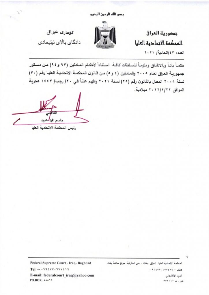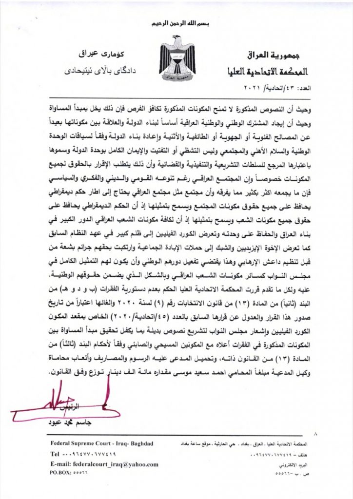 وقررت المحكمة الاتحادية العليا الحكم بعدم دستورية الفقرات (ب) و(د) و(هـ) من البند ثانيا من المادة 13 من قانون الانتخابات رقم 9 لسنة 2020 والغائها واعتبارا من تاريخ صدور هذا القرار والعدول عن قرارها السابق بالعدد 45/اتحادية/2020 الخاص بمقعد المكون الكورد الفيليين.