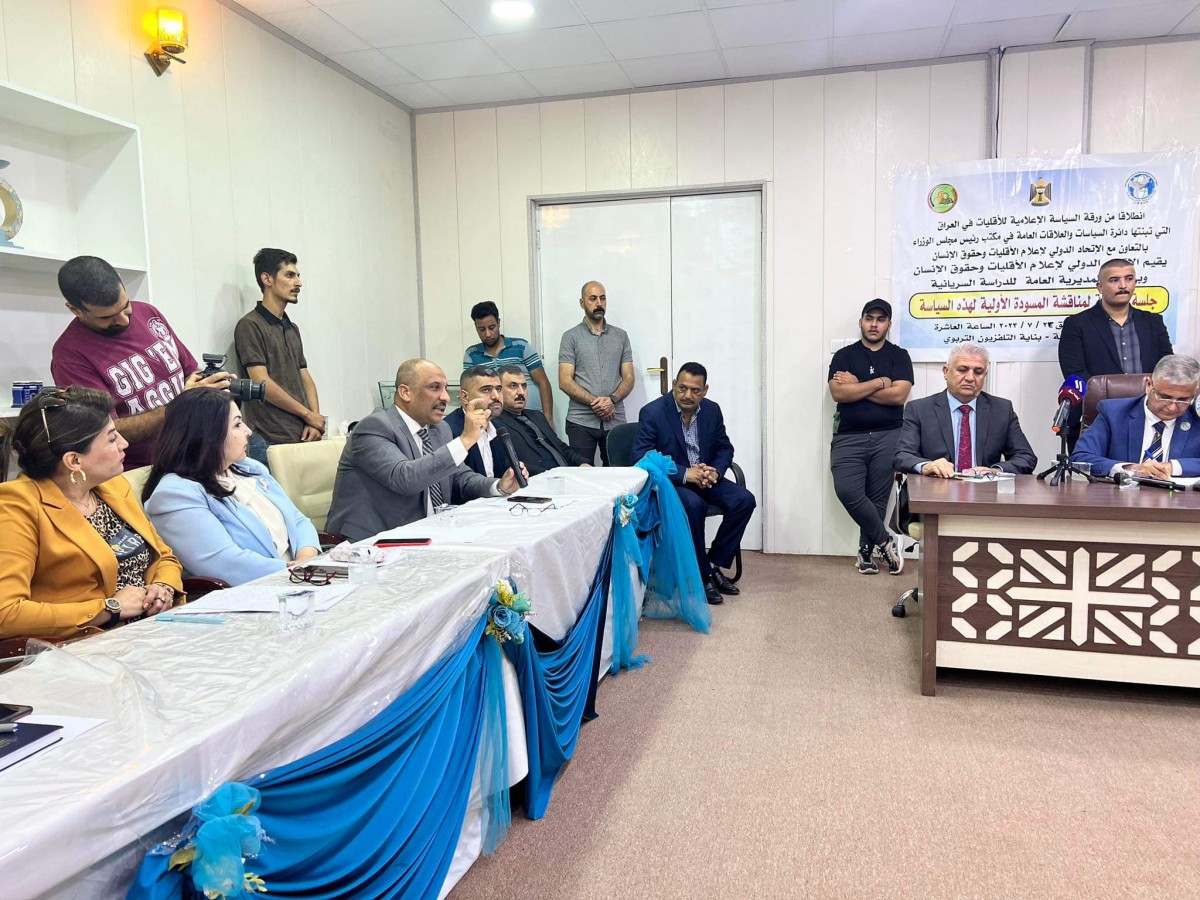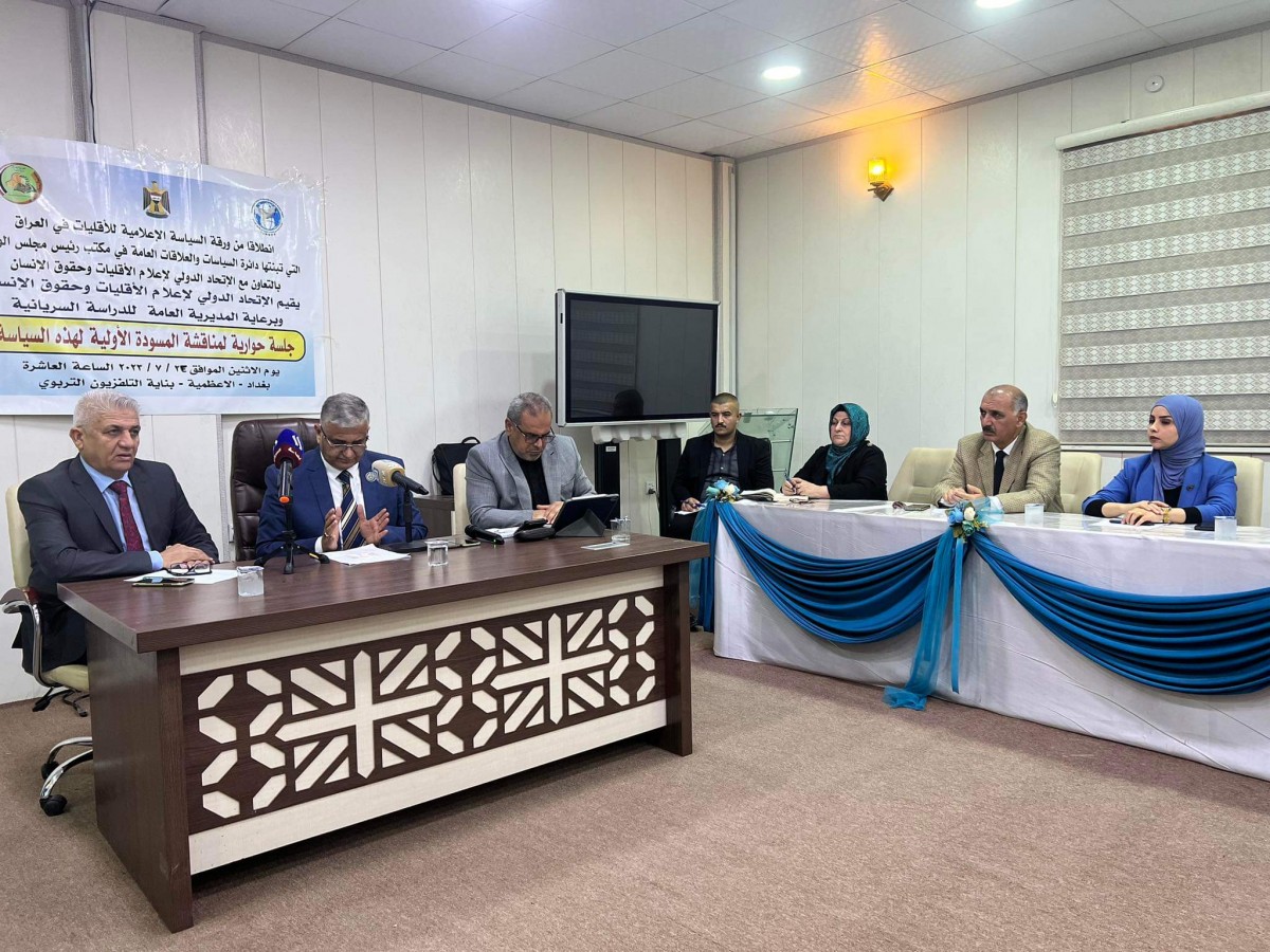 برعاية المديرية العامة للدراسة السريانية، وانطلاقا من ورقة السياسة الاعلامية للاقليات في العراق والتي تبنتها دائرة السياسات والعلاقات العامة في مكتب رئيس مجلس الوزراء، اقام الاتحاد الدولي لاعلام الاقليات وحقوق الانسان ، جلسة حوارية لمناقشة المسودة الاولية لهذه السياسة، وذلك صباح يوم الاثنين الموافق 24 تموز 2023 على قاعة التلفزيون التربوي في بغداد.