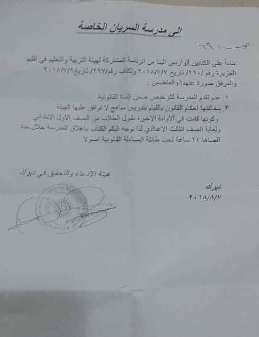 يوم الثلاثاء 7/8/2018 وجّهت هيئة التربية في إقليم الجزيرة والتابعة لسلطة الأمر الواقع (الإدارة الذاتية الديمقراطية) كتابا إلى إدارة مدرسة السريان الخاصة في ديريك (المالكية)، تنذرها بإغلاق المدرسة خلال مدّة أقصاها 24 ساعة تحت طائلة المساءلة القانونية، متذرعة بحجج واهية وغير مقنعة منها: عدم قيام الإدارة بترخيص المدرسة ضمن المدة القانونية، ومخالفتها أحكام القانون بالقيام بتدريس مناهج لا توافق عليها الهيئة، وكونها قامت في الآونة الأخيرة بقبول الطلاب من الصف الأول الابتدائي ولغاية الصف الثالث الإعدادي . وكانت هيئة التربية قد وجّهت إنذارا مماثلا لمدرسة السريان الخاصة في مدينة الدرباسية مهدّدة إيّاها بالإغلاق أيضا.