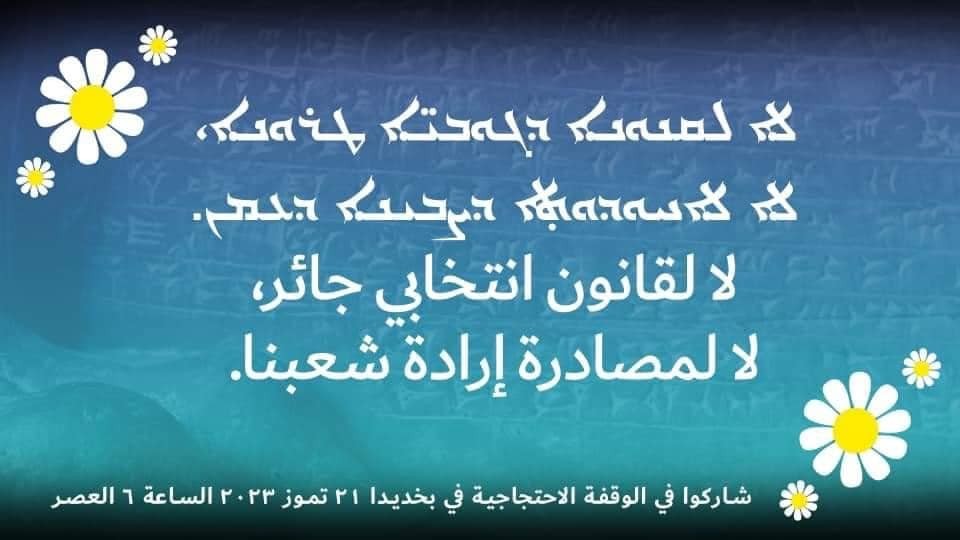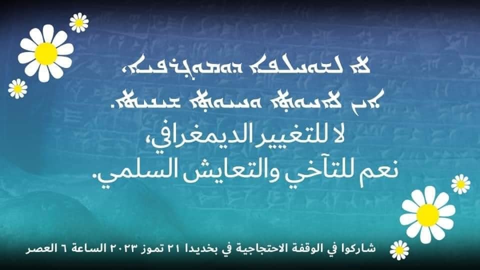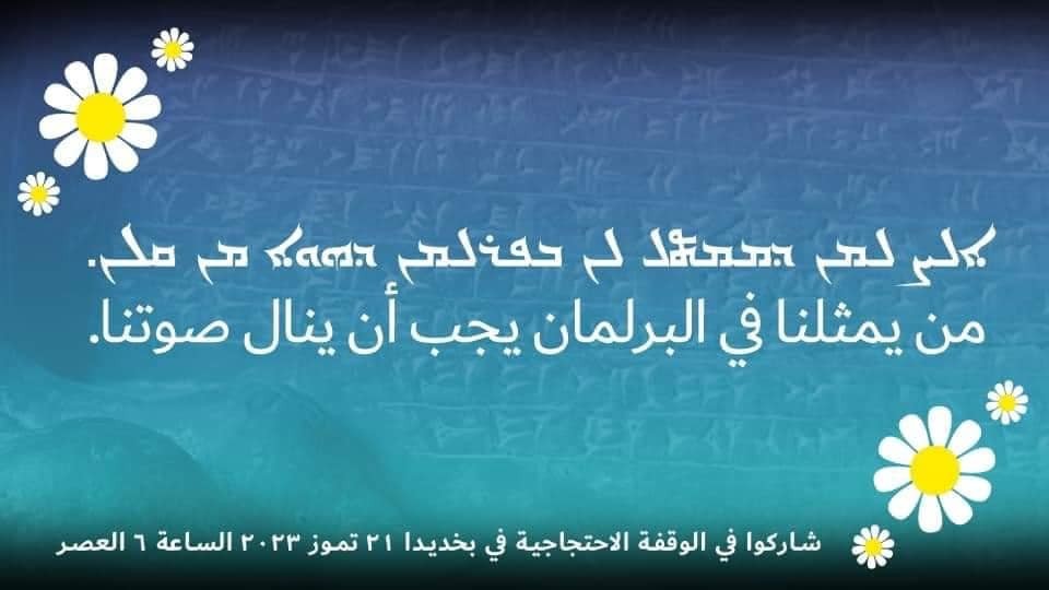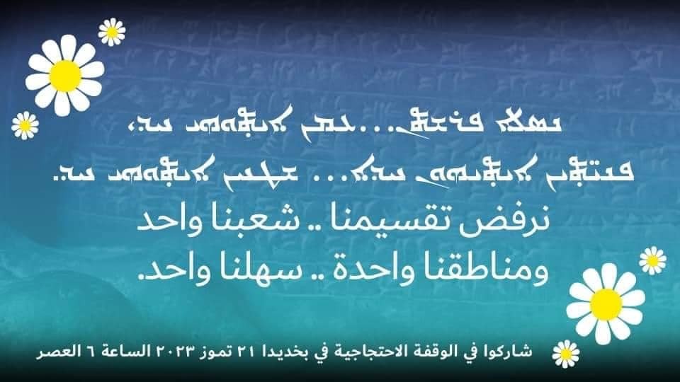 وفي هذا السياق فقد قررت خمسة من أحزابنا القومية الممثلة لشعبنا الكلداني السرياني الآشوري في العراق تنظيم وقفة احتجاجية في بلدة بغديدا يوم غد الجمعة، الحادي والعشرين من شهر تموز الحالي، للتنديد بهذه الممارسات ومطالبة الجهات المسؤولة النظر في شأنها.