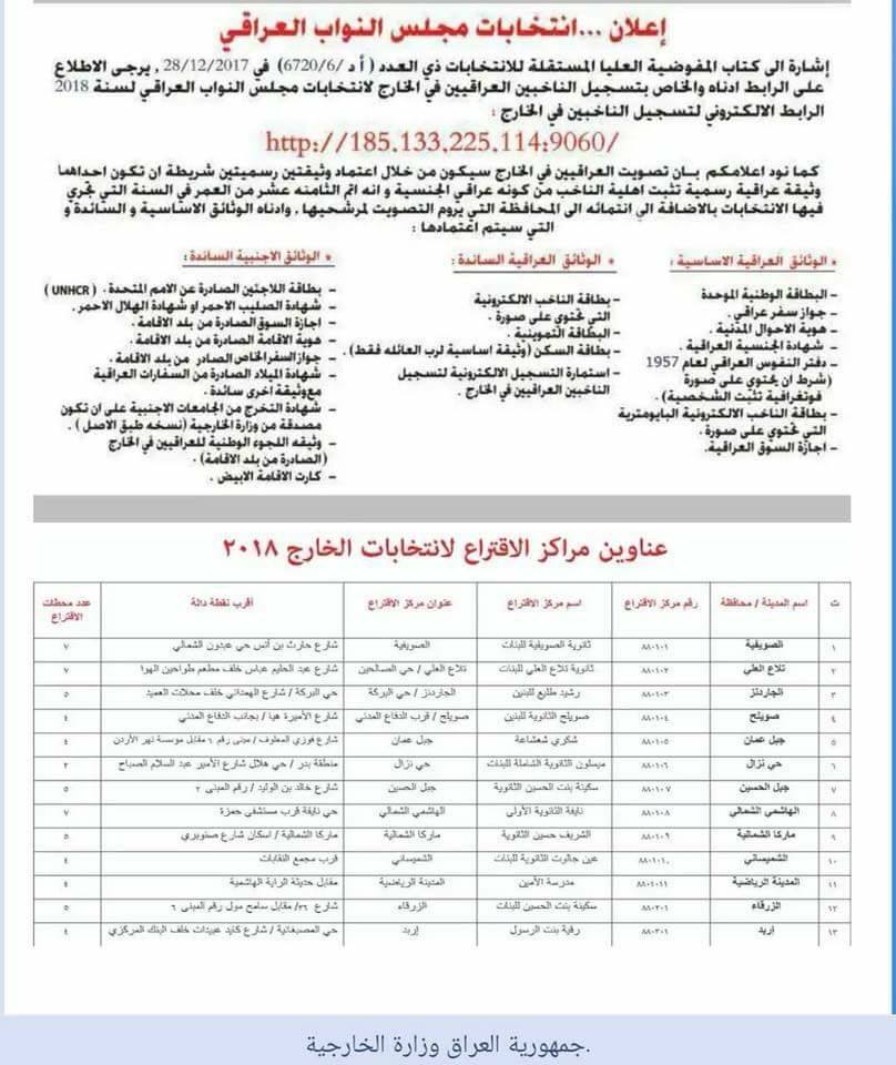 بالجداول… عناوين المركز الانتخابية في دول المهجر لانتخابات لمجلس النواب العراقي لعام ٢٠١٨