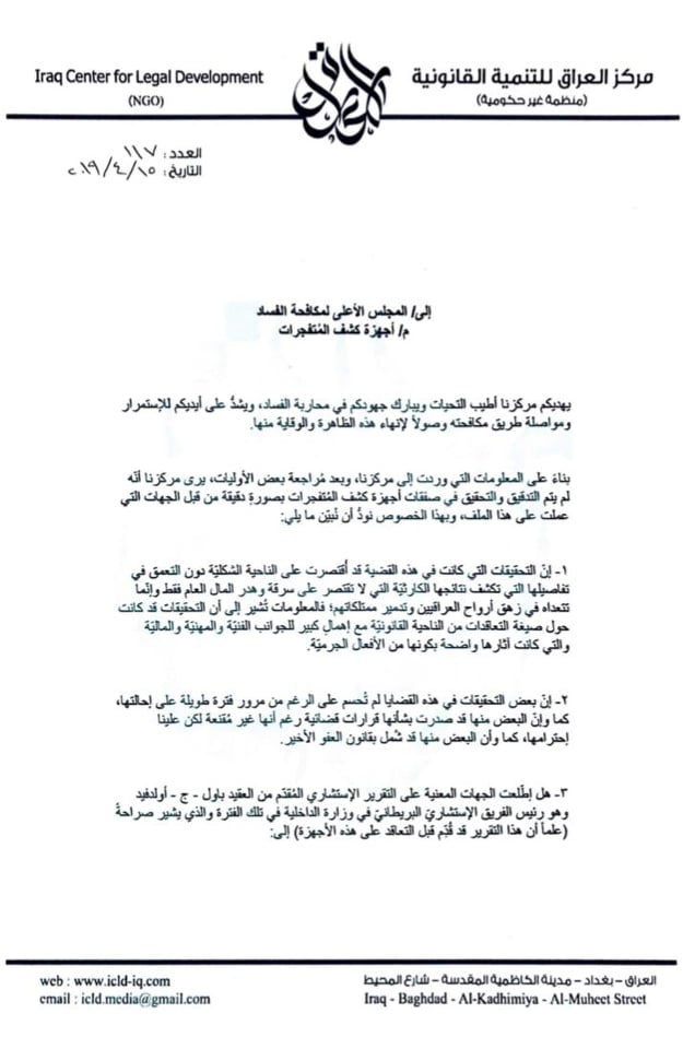 وطالب المركز المجلس الأعلى لمكافحة الفساد بتدقيق المعلومات المرسلة والتي بلغت خمس عشرة نقطة واتخاذ القرار المناسب بشأنها وفقا للقانون.