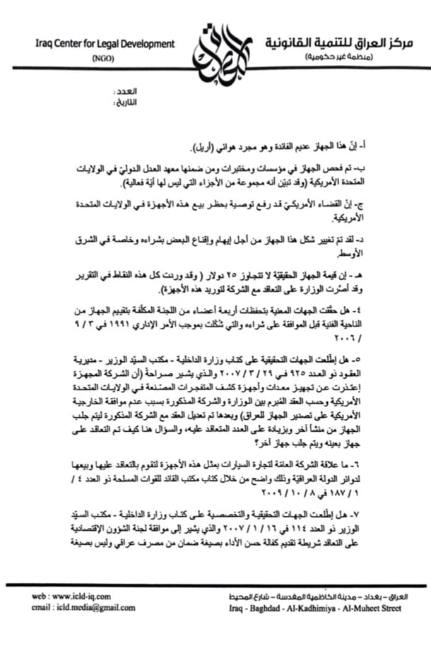 كشف مركز العراق للتنمية القانونية ICLD ، الثلاثاء، التفاصيل الكاملة لصفقات أجهزة كشف المتفجرات حيث قام بإحالتها للجهات المختصة.