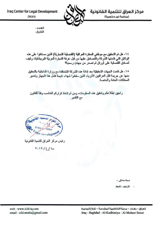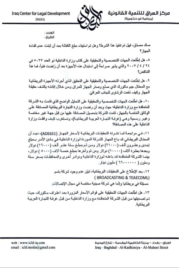 وبحسب وثائق نشرها المركز، اليوم، 16 نيسان 2019، فان” ICLD كشف عن التفاصيل الكاملة لملف عقود صفقات أجهزة كشف المتفجرات ( ADE 651 ) الموردة لصالح وزارة الداخلية والمحافظات ودوائر أخرى.