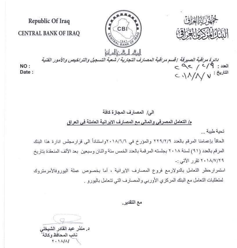 وجه البنك المركزي العراقي بحظر التعامل بالدولار مع المصارف الايرانية بعد ايام من بدء تنفيذ الدفعة الاولى من العقوبات الامريكية على ايران.
