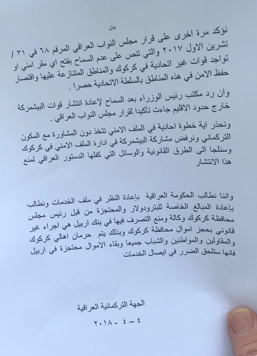 وذكر بيان للجبهة التركمانية اليوم (4 نيسان 2018) ، اننا “نؤكد مرة اخرى على قرار مجلس النواب المرقم 68 في 31 تشرين الاول 2017 والتي تنص على عدم السماح بفتح اي مقر امني او تواجد قوات غير اتحادية في كركوك والمناطق المتنازع عليها واقتصار حفظ الامن في هذه المناطق بالسلطة الاتحادية”.
