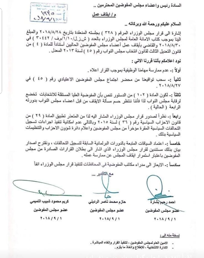 وجاء في الوثيقة التي نشرت أول أمس السبت، 1 أيلول، ان كلا من أعضاء مجلس المفوضين أحمد بشارة و حازم الرديني و كريم التميمي، أعلنوا التزامهم بقرار مجلس الوزراء الصادر يوم الثلاثاء الماضي، والقاضي بإيقاف عمل أعضاء مجلس المفوضين الحاليين استنادل للمادة 4 من قانون التعديل الثالث لقانون انتخاب مجلس النواب رقم 45 لسنة 2013 المعدل.