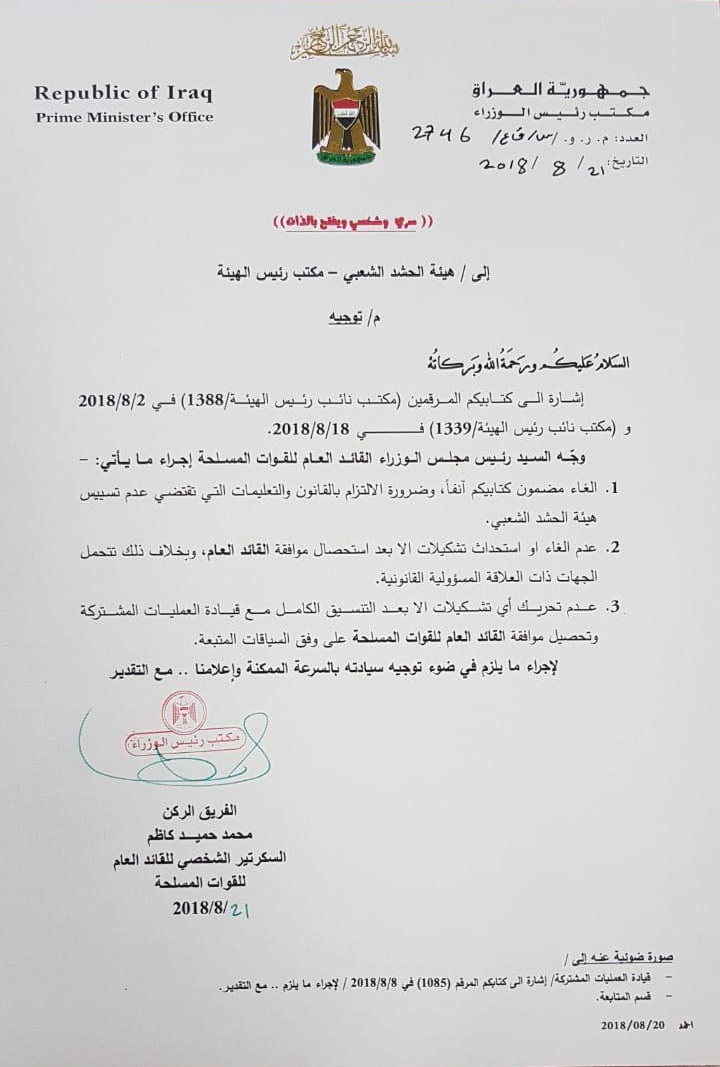 1-الغاء مضمون كتابيكم آنفاً وضرورة الالتزام بالقانون والتعليمات التي تقضي عدم تسييس هيئة الحشد الشعبي.