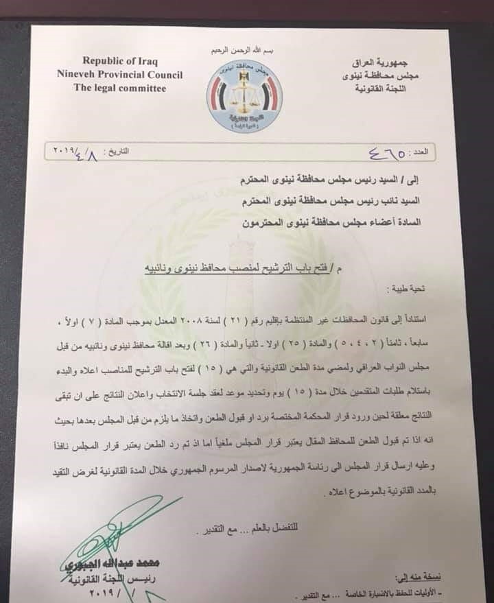 وبحسب وثيقة صادرة عن المجلس اليوم، 8 نيسان 2019، فقد تم التوجيه بفتح باب الترشيح لمنصب محافظ نينوى ونائبيه، والبدء باستلام طلبات المتقدمين للمنصب خلال 15 يوما، وتحديد موعد لعقد جلسة انتخاب المحافظ الجديد.