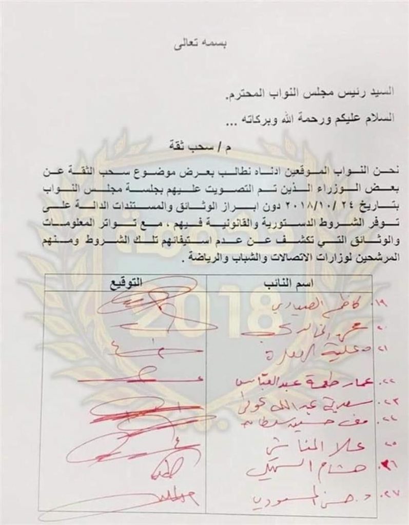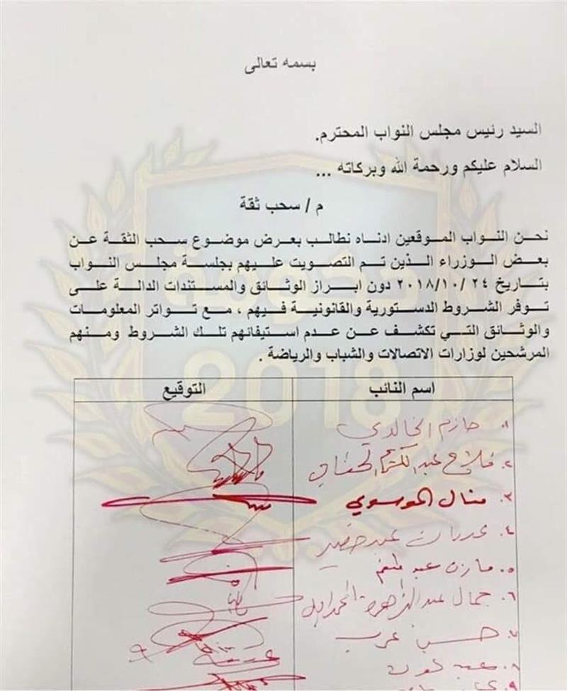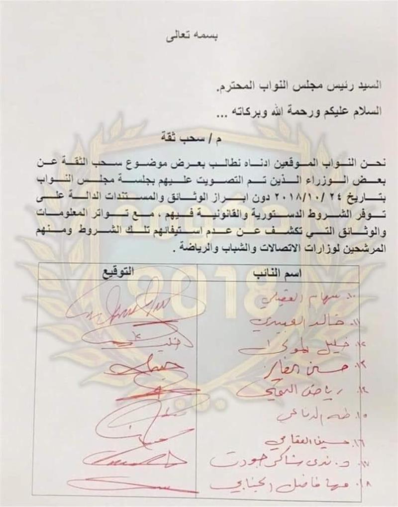 وبحسب الوثيقة، فقد وقع 27 نائبا على طلب موجه لرئيس مجلس النواب لعرص موضوع سحب الثقة عن بعض الوزراء الذين تم التصويت عليهم في جلسة مجلس النواب بتأريخ 24 تشرين الاول 2018، لعدم توافر الشروط والدستورية القانونية فيهم ومنهم المرشحين لوزارات الاتصالات والشباب والرياضة.