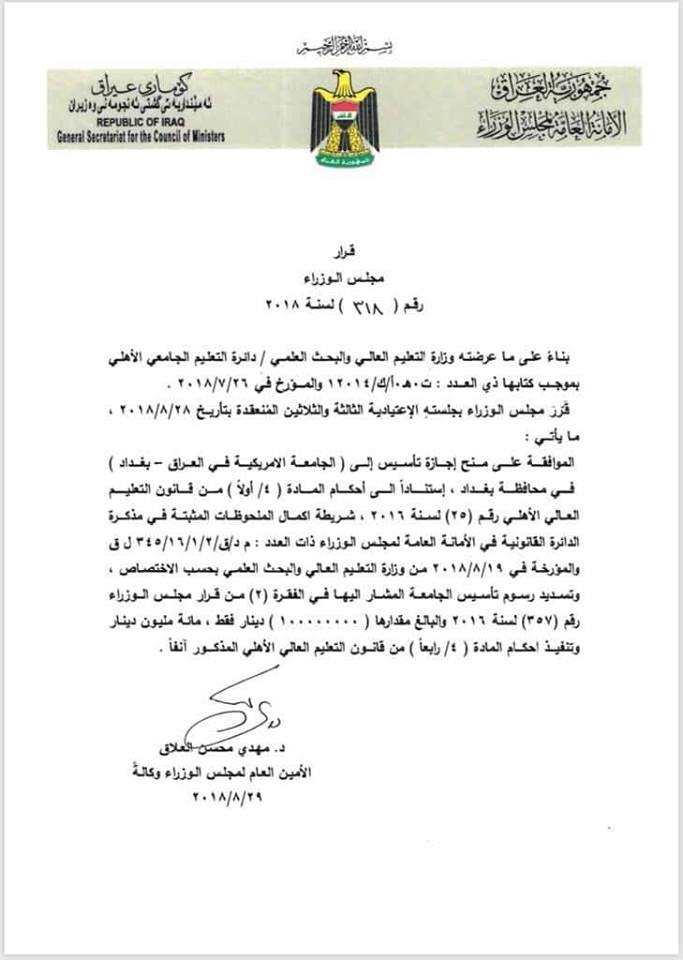 وجاء في الوثيقة ، الصادرة بتاريخ 29 آب 2018، ان”مجلس الوزراء قررالموافقة على منح اجازة تاسيس الى الجامعة الامريكية في العراق – بغداد”.