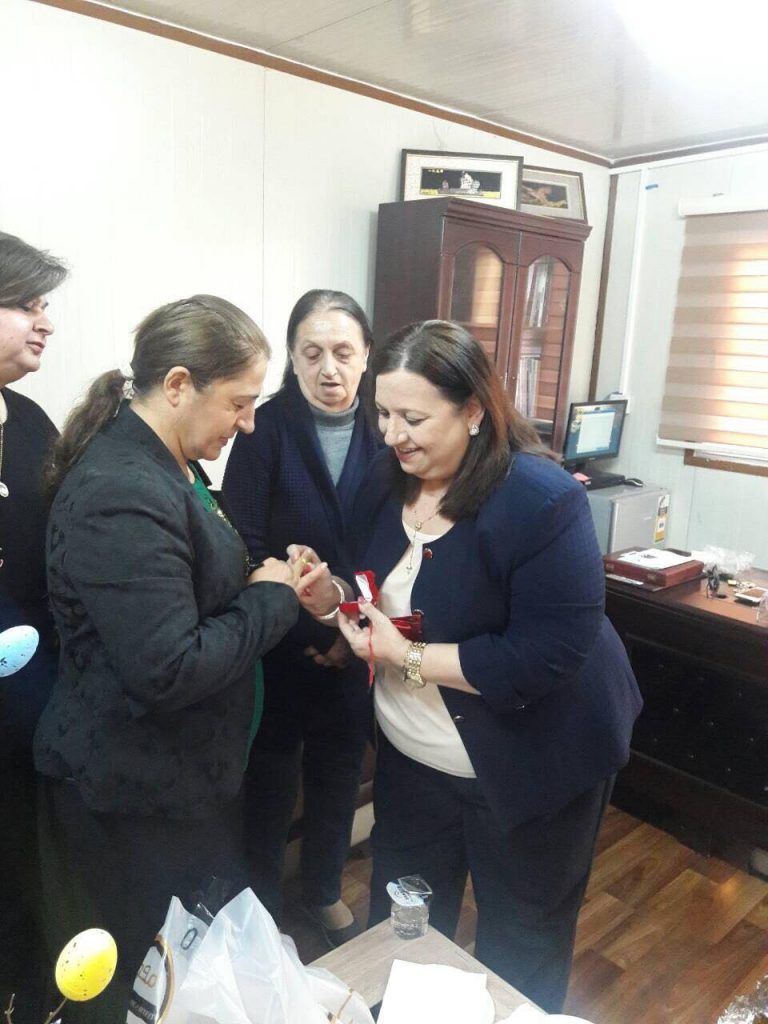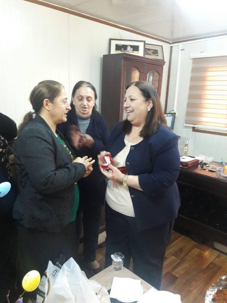 حيث تم تقديم التكريم لها من قبل السيدة مارلين يوسف مسؤولة الفرع وبحضورعدد من عضوات الفرع،وقدمن لها التهنئة بمناسبة تخرجها متمنين لها دوام الموفقية والنجاح ،وتهنأتها ايضا بمناسبة عيد الام كأم متميزة لاصرارها وتفانيها وارادتها القوية وجهودها المبذولة من أجل اكمال دراستها الى جانب خدمة اسرتها بكل تفاني.