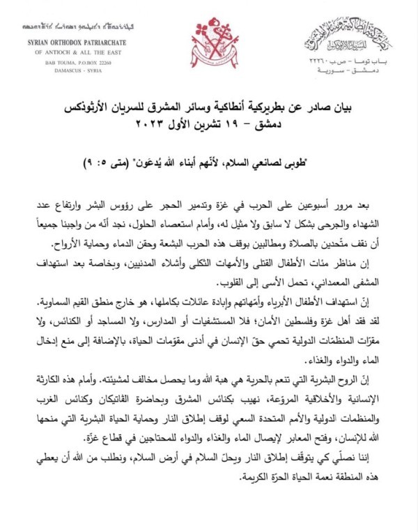 إنّ الروح البشرية التي تنعم بالحرية هي هبة الله وما يحصل مخالف لمشيئته. وأمام هذه الكارثة الإنسانية والأخلاقية المروّعة، نهيب بكنائس المشرق وبحاضرة الفاتيكان وكنائس الغرب والمنظمات الدولية والأمم المتحدة السعي لوقف إطلاق النار وحماية الحياة البشرية التي منحها الله للإنسان، وفتح المعابر لإيصال الماء والغذاء والدواء للمحتاجين في قطاع غزّة.