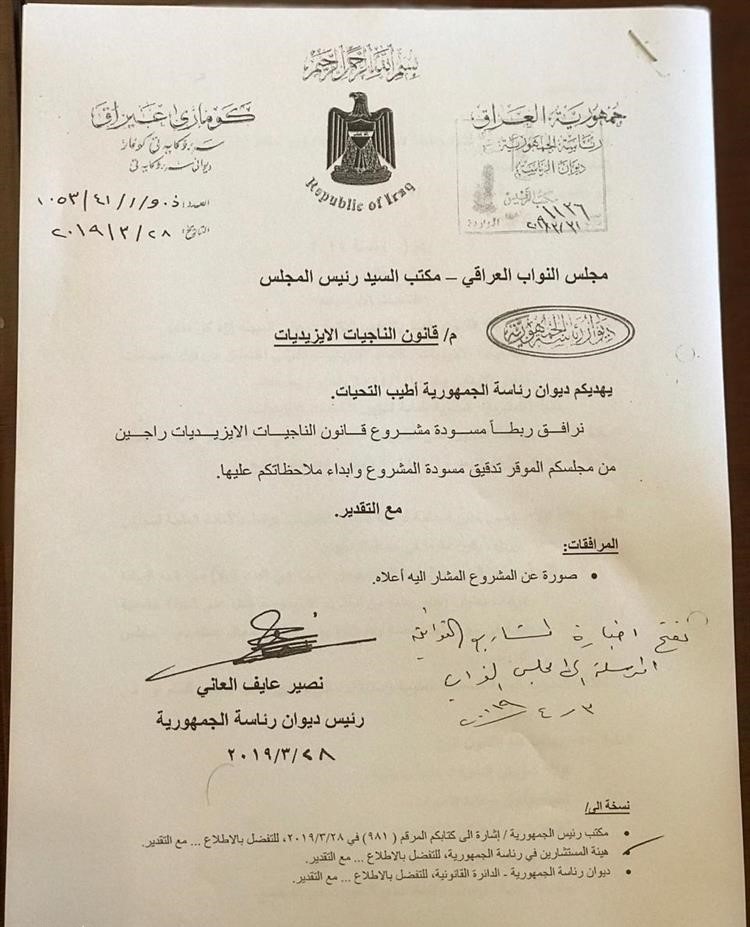 أكدت رئاسة الجمهورية، انها قامت بإرسال مشروع قانون الناجيات الأيزيديات الى مجلس النواب، لغرض مناقشته واقراره، حيث يشمل المشروع جميع النساء الأيزيديات اللواتي اختطفن من قبل عناصر داعش في حزيران 2014.