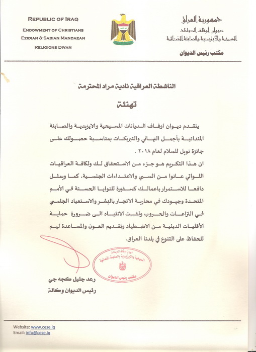 هنأ ديوان اوقاف الديانات المسيحية والايزيدية والصابئة المندائية الناشطة العراقية نادية مراد بمناسبة حصولها على جائزة نوبل للسلام للعام 2018م… وهي ناشطة أيزيدية عراقية من قرية كوجو في قضاء سنجار.