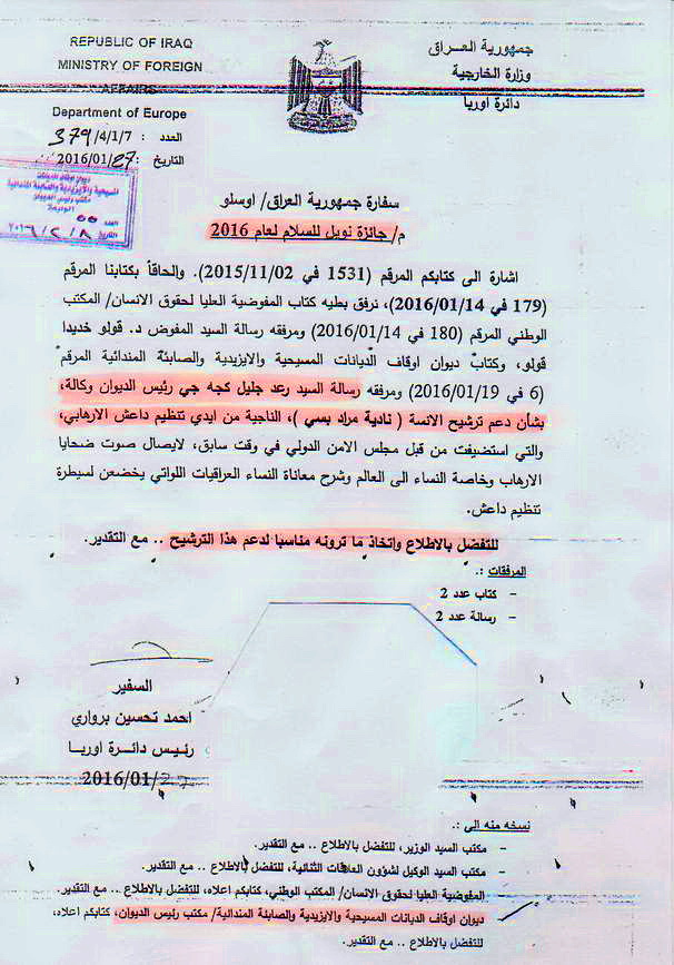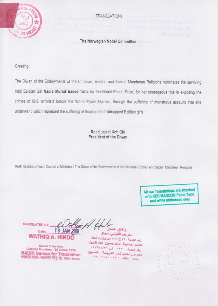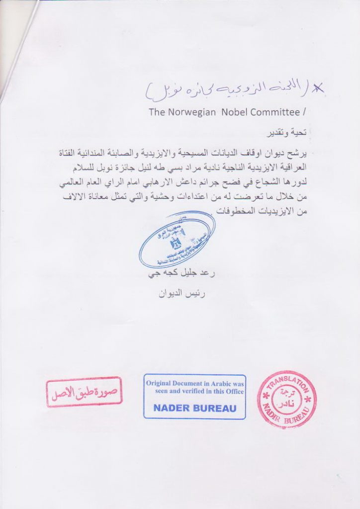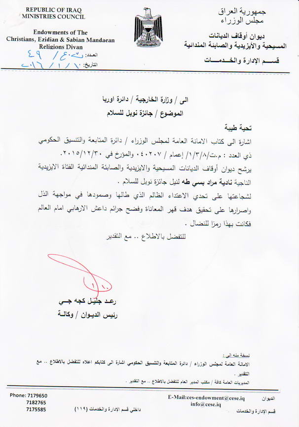 كان الديوان قد رشحها لنيل جائزة نوبل للسلام في 10كانون الثاني 2016 بكتاب الى وزارة الخارجية لشجاعتها خلال الحملات التي اطلقتها ضد الاغتصاب وتحدي الاعتداء الظالم الذي طالها من قبل مايعرف بتنظيم الدولة الاسلامية الارهابي.. وفضح جرائمه امام العالم وما تعرضت له من انتهاكات جسدية وحشية.. وما تعرض له الشعب العراقي الأيزيدي من انتهاكات أيدي مقاتلي تنظيم الدولة اواخر 2014م تمثلت في قتل 600 شخص من قريتها، من ضمنهم ستة من إخوانها، وأمها، وسبي النساء الشابات كجواري.