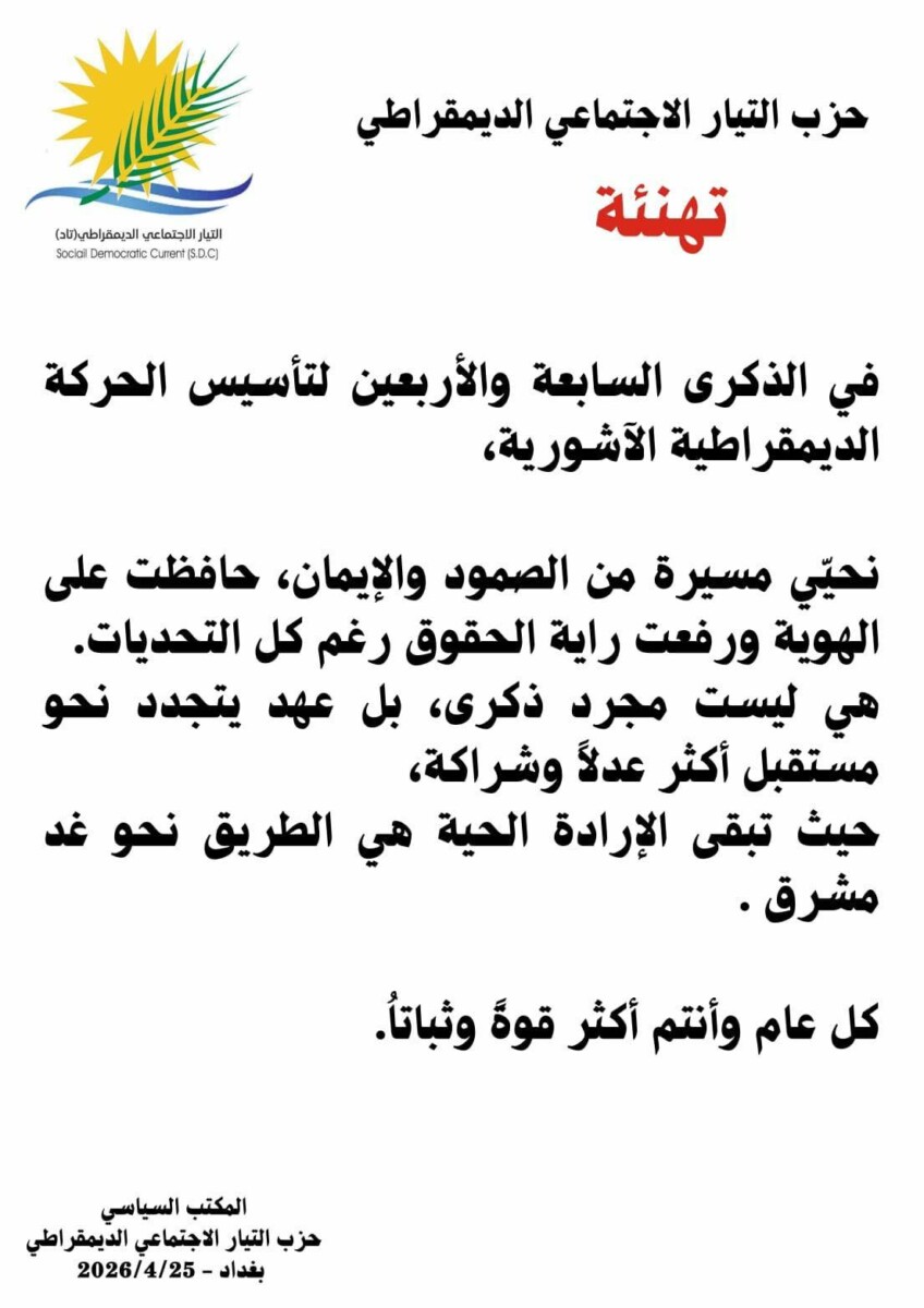 حزب التيار الاجتماعي الديمقراطي يهنئ حركتنا الديمقراطية الآشورية بذكرى تأسيسها