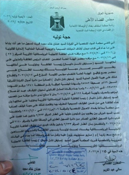وأضاف، “وتضمنت رسالة التأييد أيضا نسخة من نص القرار الصادر من رئاسة محكمة استئناف بغداد/ الرصافة الاتحادية، يتضمن حجة توليه على طائفته ننشره عملا بحرية النشر، وليطلع عليها الرأي العام”.