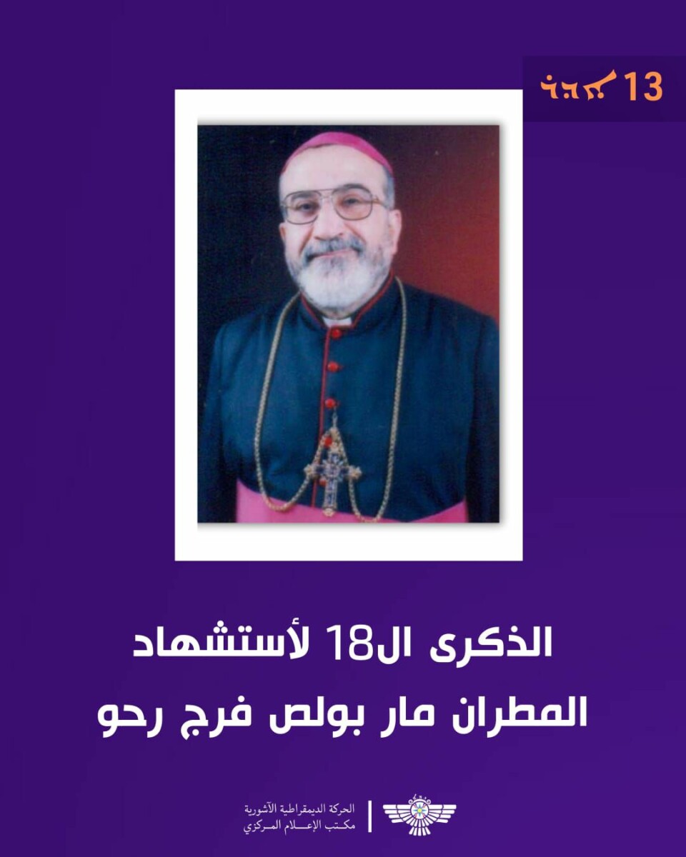 وفي هذه الذكرى الثامنة عشرة، نجدد العهد بأن تبقى دماء المطران الشهيد مار بولص فرج رحو، ودماء جميع شهداء شعبنا ووطننا، منارة تهدينا في مسيرتنا نحو الحرية والمساواة، وترسخ في وجداننا معنى التضحية في سبيل الحق.