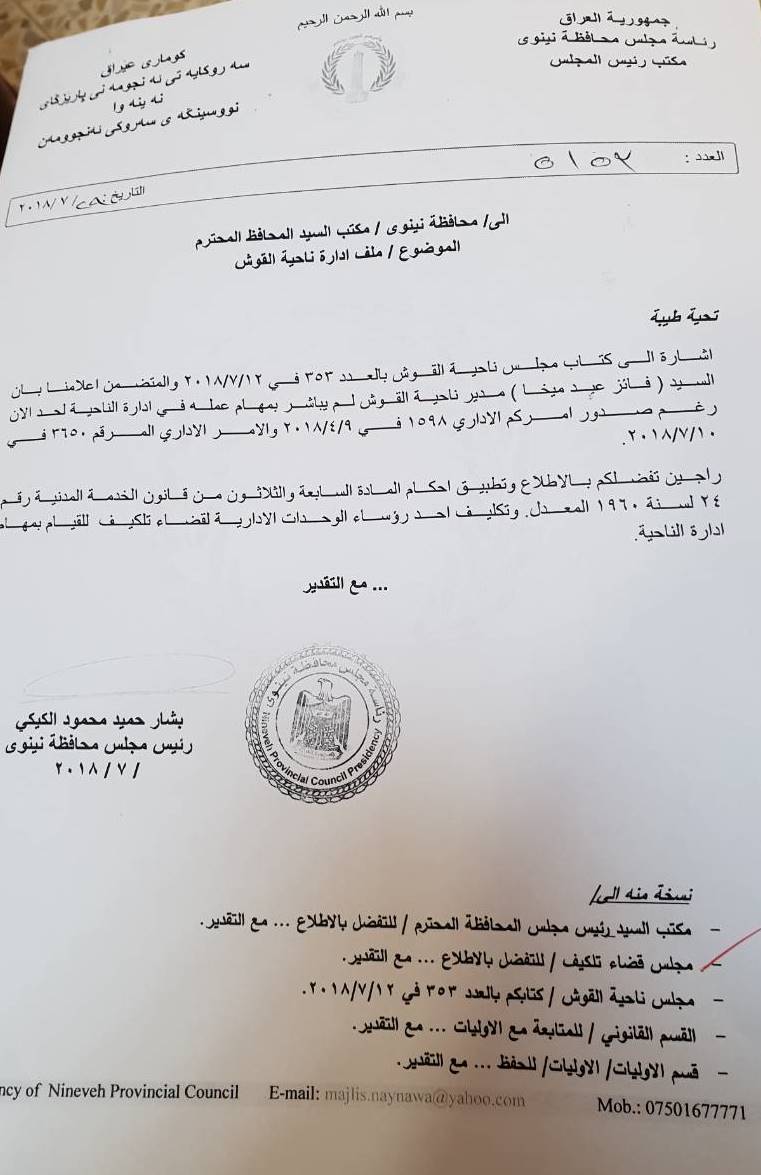 جاء ذلك في كتاب لرئيس مجلس محافظة نينوى بشار الكيكي التابع للحزب الديمقراطي الكردستاني، موجه الى مكتب محافظ نينوى، اشارة الى كتاب مجلس ناحية القوش والذي معظم اعضاءه من البارتي، والمتضمن اعلامهم بان فائز عبد ميخا مدير ناحية القوش لم يباشر بمهام عمله في ادارة الناحية لحد الان، رغم صدور امر اداري من المحافظة باعادته مديرا للناحية.