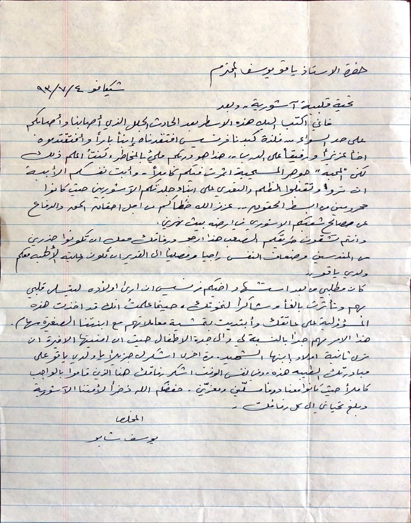 فاني اكتب اليك هذه الاسطر بعد الحادث الجلل الذي اصابنا واصابكم على حد السواء… فلذة كبدنا فرنسيس افتقدناه ابناً باراً وافتقدتموه اخاً عزيزاً ورفيقاً على الدرب.. هذا هو دربكم مليئ بالمخاطر. كنت اعلم ذلك لكن “المحبة” جوهر المسيحية اثمرت فيكم كاملا. وابت نفسكم الابية ان تروا وتقبلوا الظلم والتعدي على ابناء جلدتكم الاشوريين حيث كانوا محرومين من ابسط الحقوق.. عزز الله خطاكم من اجل احقاق الحق والدفاع عن مصالح شعبكم الاشوري في ارضه بيث نهرين.