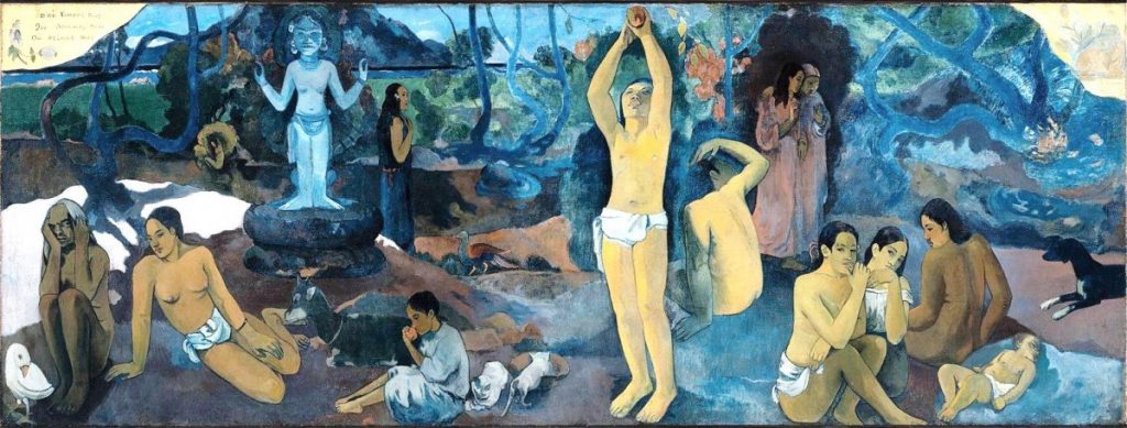 ولم تخلو الفنون من خوض عباب هذا البحر المتلاطم من المحاولات، علّها تفلح بقبس من نور يُضيء ويُعطي الجواب، للخلاص من هذا المأزق الأزلي المُقلق لحال الإنسان…. فرباعيات الخيام، صدح صوت أم كلثوم بها(سمعتُ صوتاً هاتفاً في السحر)، وايليا أبو ماضي صدح صوت عبد الحليم ببعضٍ من أبيات “طلاسمه” ( جئتُ لا أعلم من اين ولكني أتيت)، .. وغيرهم كثيرين، ولاننسى الفنان الفرنسي ﭙول جوجان الذي أختصر تساؤلات الإنسان عن الوجود بلوحة رائعة شاملة، عنوَنَها بعبارة: من أين نأتي، من نحن؟ إلى أين نمضي…،