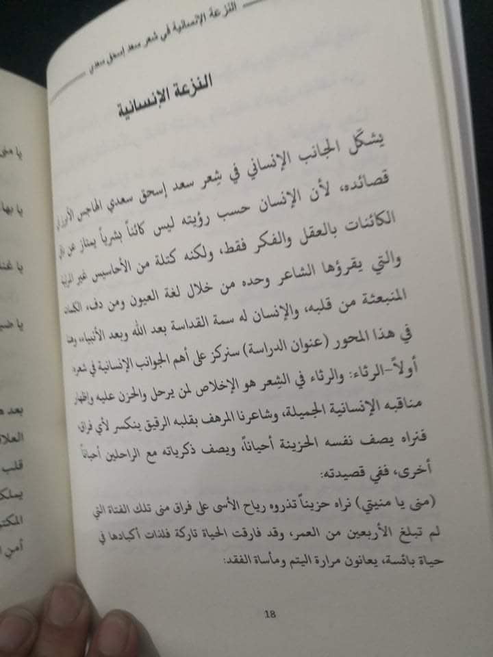 ويقول الكاتب عن الشاعر الرحل سعد اسحق سعدي، يشكل الجانب الانساني في شعر سعد اسحق سعدي الهاجس الابرز في قصائده، لان الانسان حسب رؤيته ليس كائنا بشريا يمتاز عن باقي الكائنات بالعقل والفكر فقط، لكنه كتلة من الاحاسيس الغير مرئية والتي يقرأها الشاعر وحده من خلال لغة العيون .