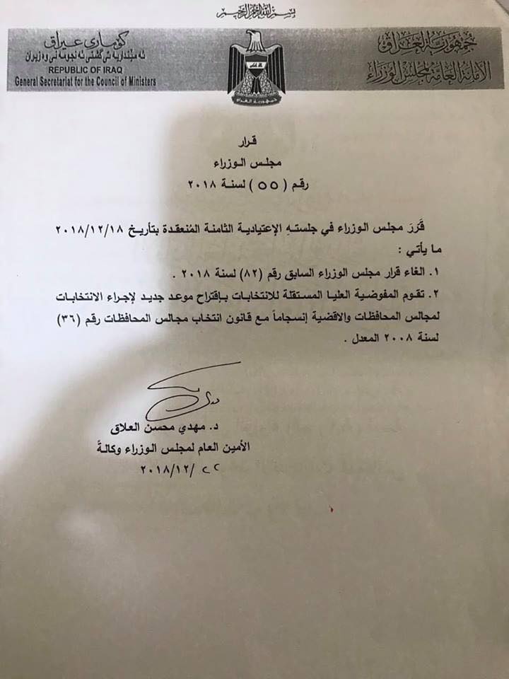 وحسب الوثيقة الصادرة مجلس الوزراء يتاريخ 22 كانون الاول 2018 فأنه يتم تخويل المفوضية العليا المستقلة للانتخابات بتحديد الموعد الجديد لإجرائها.