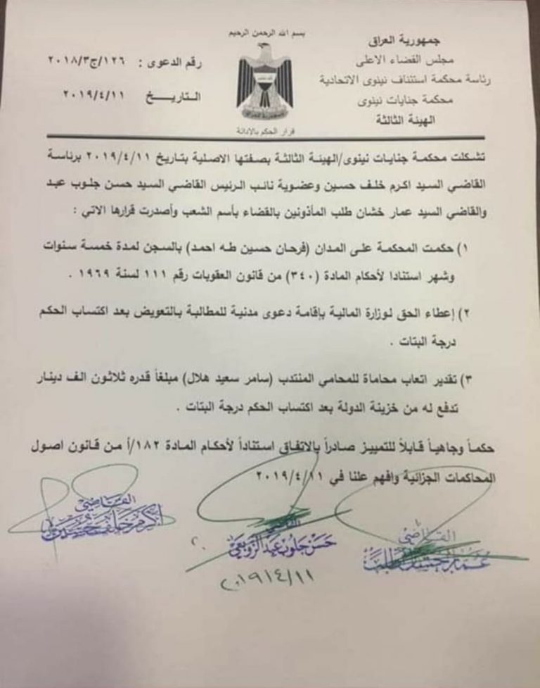 وأكدت المحكمة بحسب الوثيقة، أن “الحكم اتى وفق المادة 340 من قانون العقوبات رقم 111 لسنة 1969”.